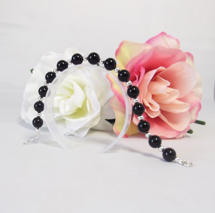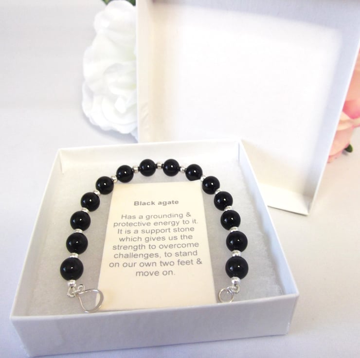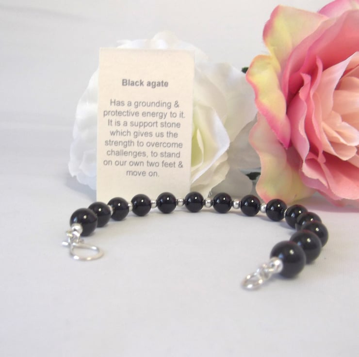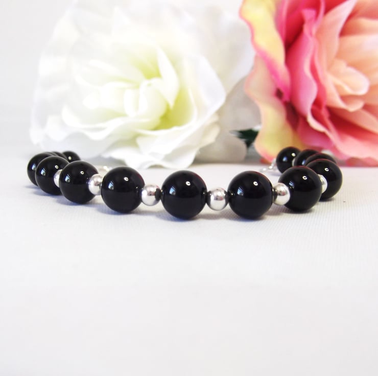 Black Agate gemstone and sterling silver bead bracelet recycled silver clasp