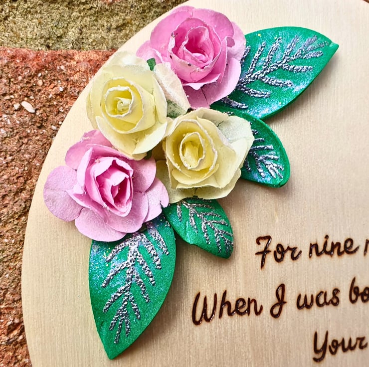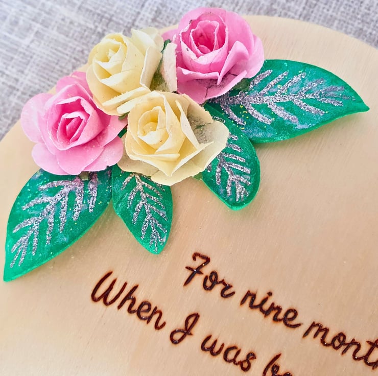 In the middle of the heart, an exclusive poem has been handwritten with the method of pyrography. Firstly, the poem is traced with pencil, and then, each word is burnt on the wood, with the use of a pyrography tool. The pencil marks are then erased, for a nice, clean finish. The next stage, includes varnishing the decoration with melamine lacquer, for protection and extra longevity. Once dry, the decoration is ready for the floral embellishments. The leaves are cut and heat embossed with silver, while all elements have a thin layer of mica mist for a touch of shine. There are 2 cream & 2 pink roses, with green leaves.