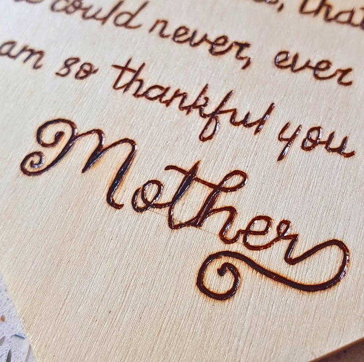 A Heart shaped, wooden hanging decoration, made with the method of pyrography, to celebrate a person's love and appreciation for their Mum!