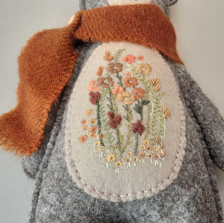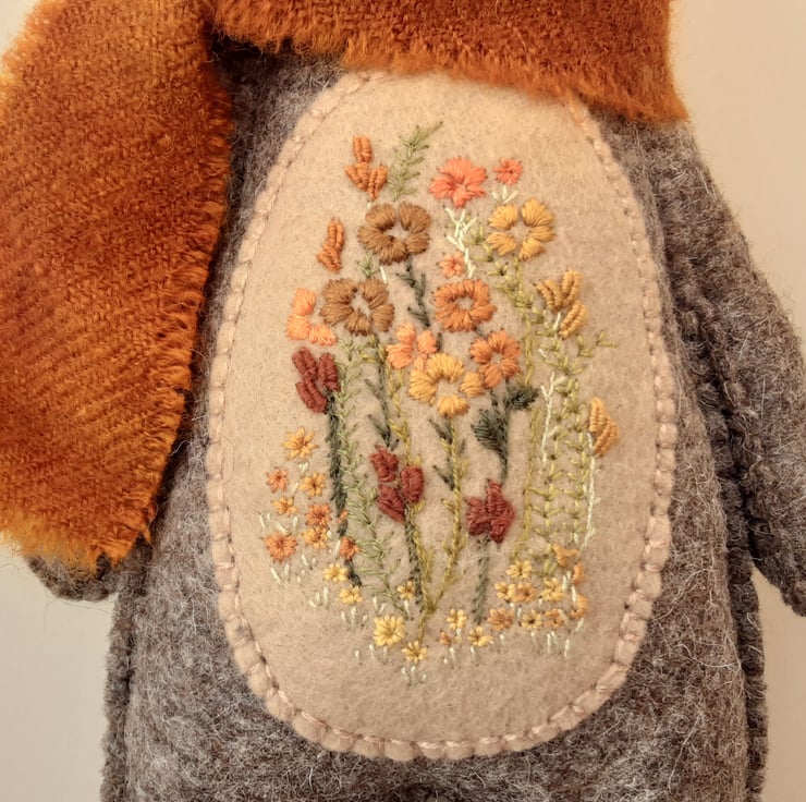 His contrast tummy area has been lavishly hand embroidered in a unique floral design in lovely greens, burnt oranges, mustards, browns and rusts onto camel brown contrast 40% blended felt, a little piece of a cottage garden or woodland hedgerow.