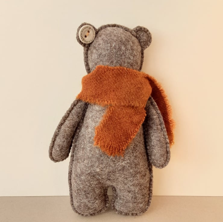 Teddy bear measures approx 8" tall, completely hand sewn from premium 2mm thick 100% wool felt in a lovely grey brown shade, a melange felt.