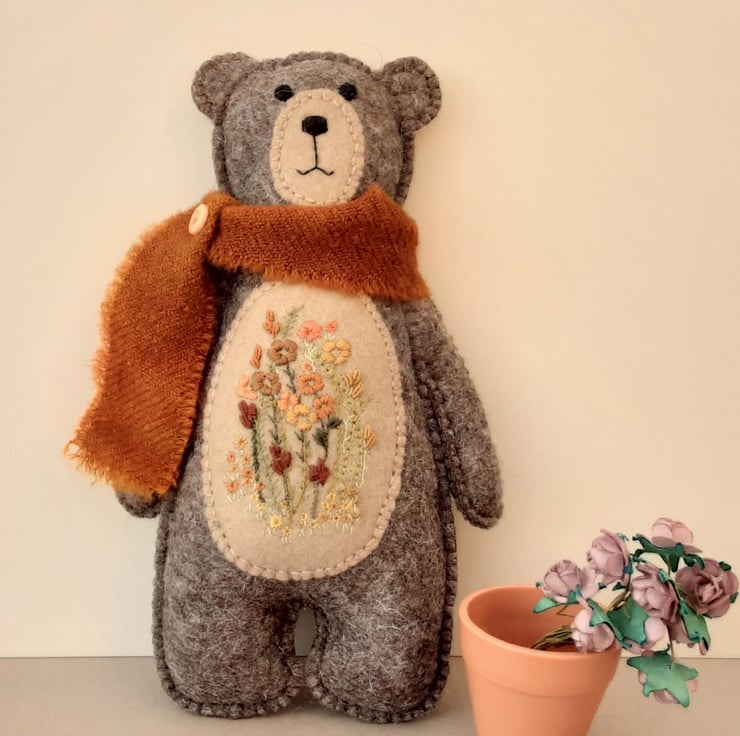 A hand embroidered and hand sewn woodland teddy bear, scandi style unique bear designed and created by Bearlescent