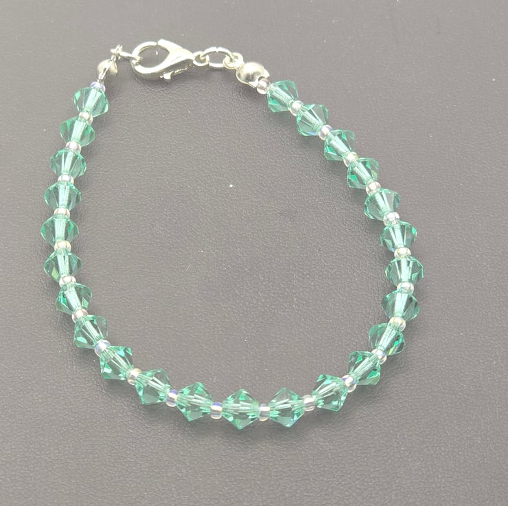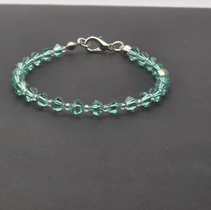 The bracelet was made using 5mm Preciosa Crystal Bicones in the colour Caribbean Sea. The Preciosa Crystal Bicones are all the way around the bracelet and have small crystal AB seed beads in between. The beads are on a thin beading wire and fasten with a silver clasp.