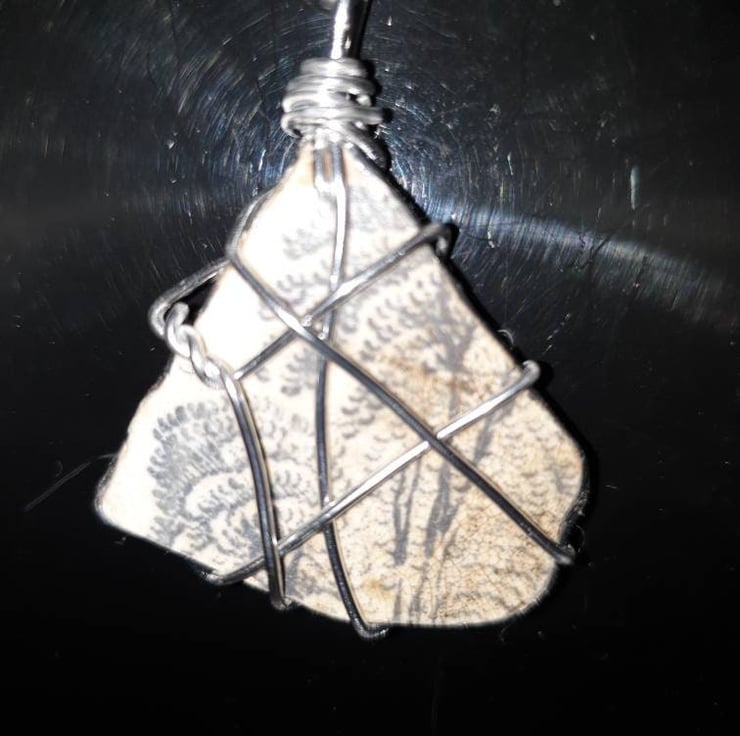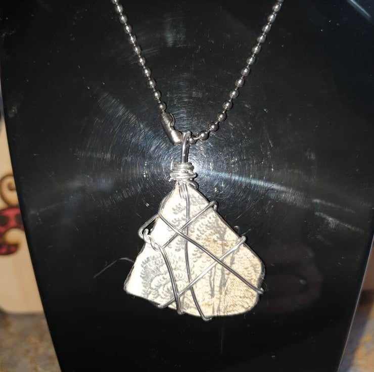 This piece of pottery was found locally near the river behind my home, I wire wrapped it and added a stainless steel ball chain