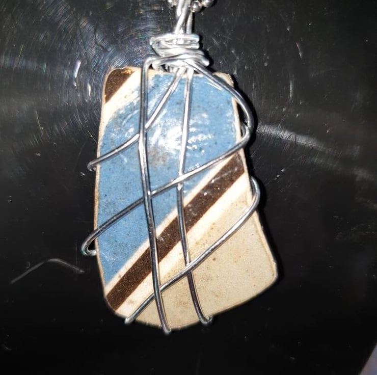Wire wrapped blue stripe pottery pendant. The pottery was found locally. A stainless steel ball chain as been added