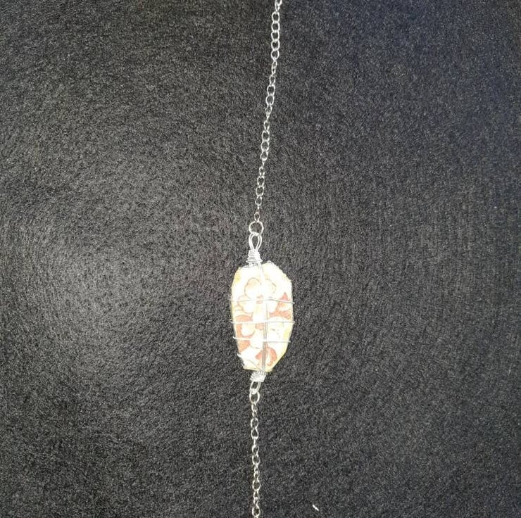 A floral piece of pottery found locally, wire wrapped with an added stainless steel chain