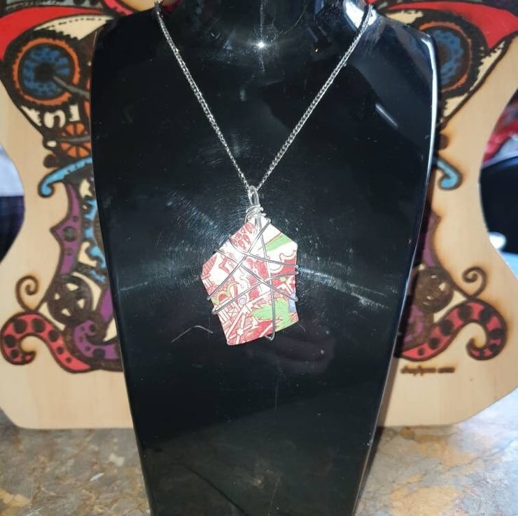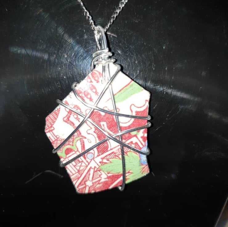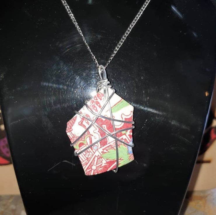 Red scenic piece of pottery found locally and wire wrapped with a stainless steel chain added