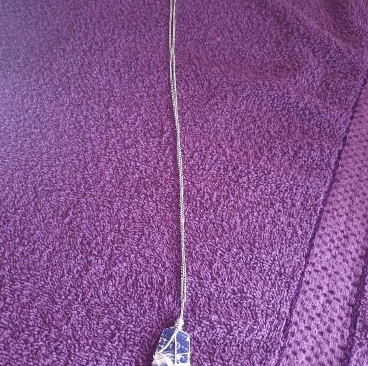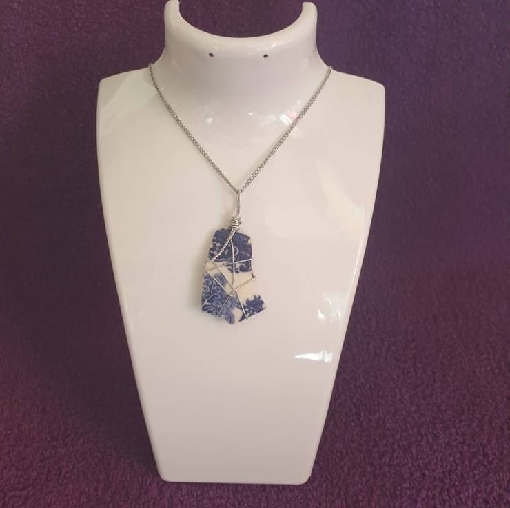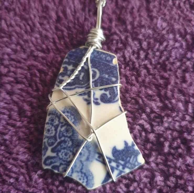 Partial Willow pattern piece, wire wrapped with a stainless steel chain added
