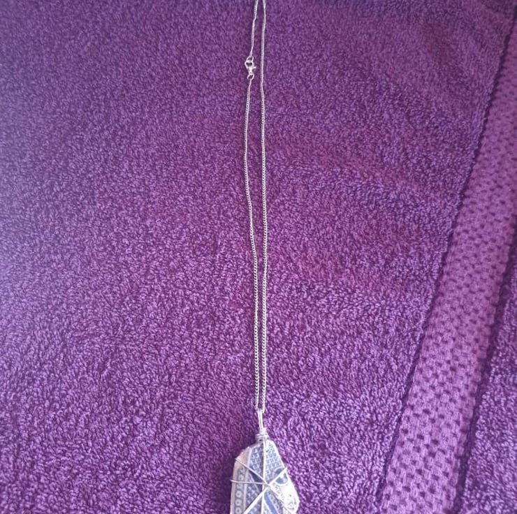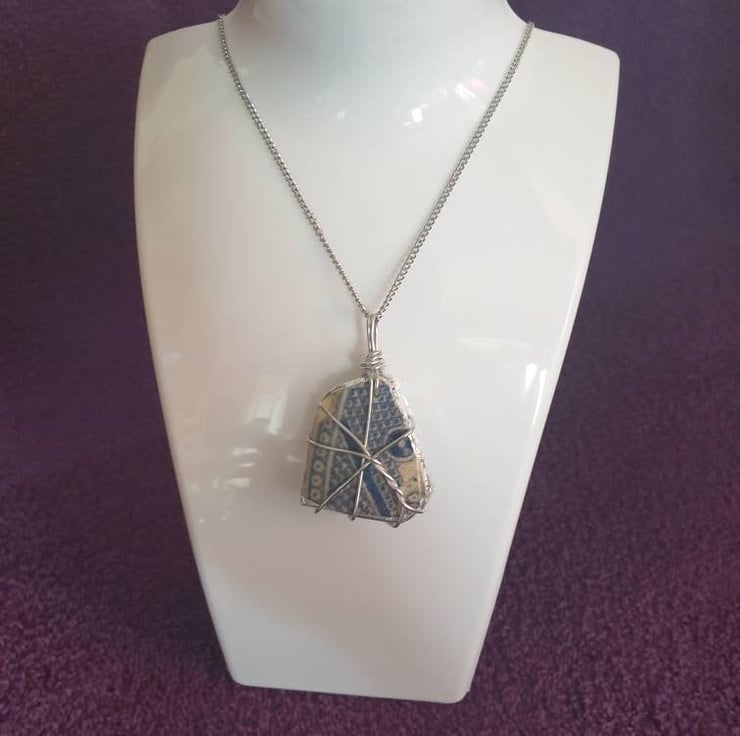 Piece of blue patterned pottery, wire wrapped with a stainless steel chain added