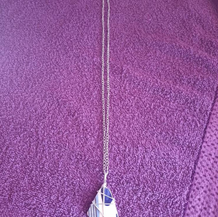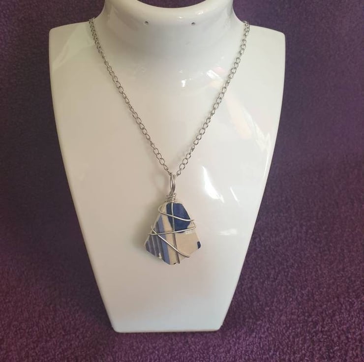 Lovely blue and white piece of pottery, wire wrapped with a stainless steel bail and chain added