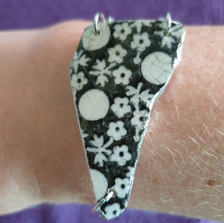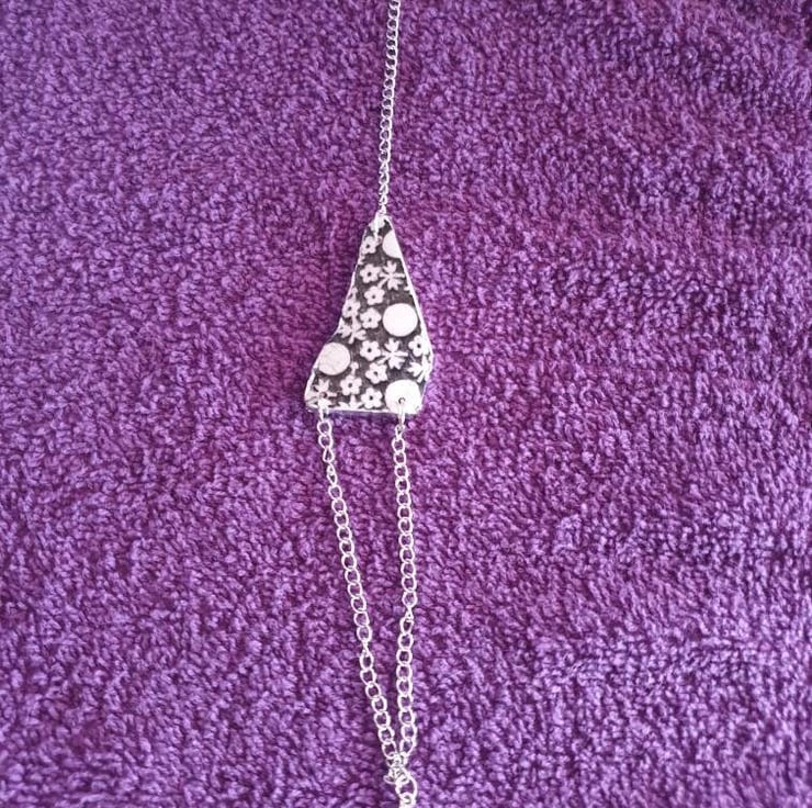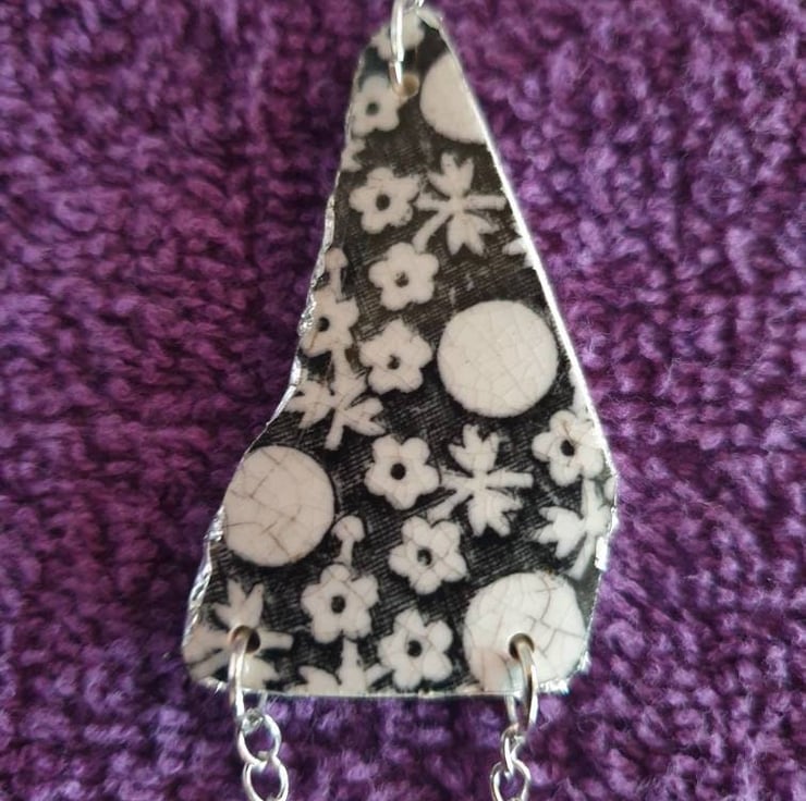 Beautiful piece of black floral pottery, found locally, with an added stainless steel chain.