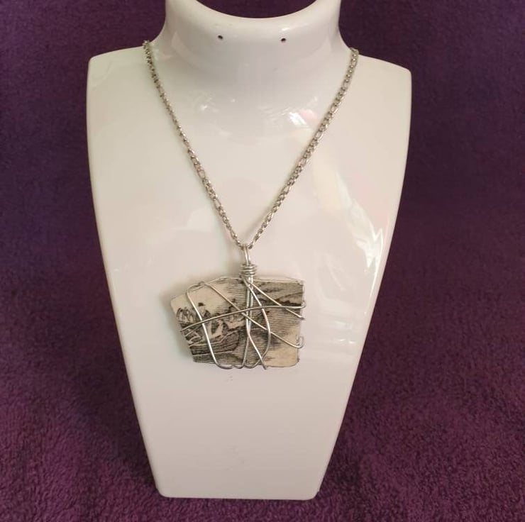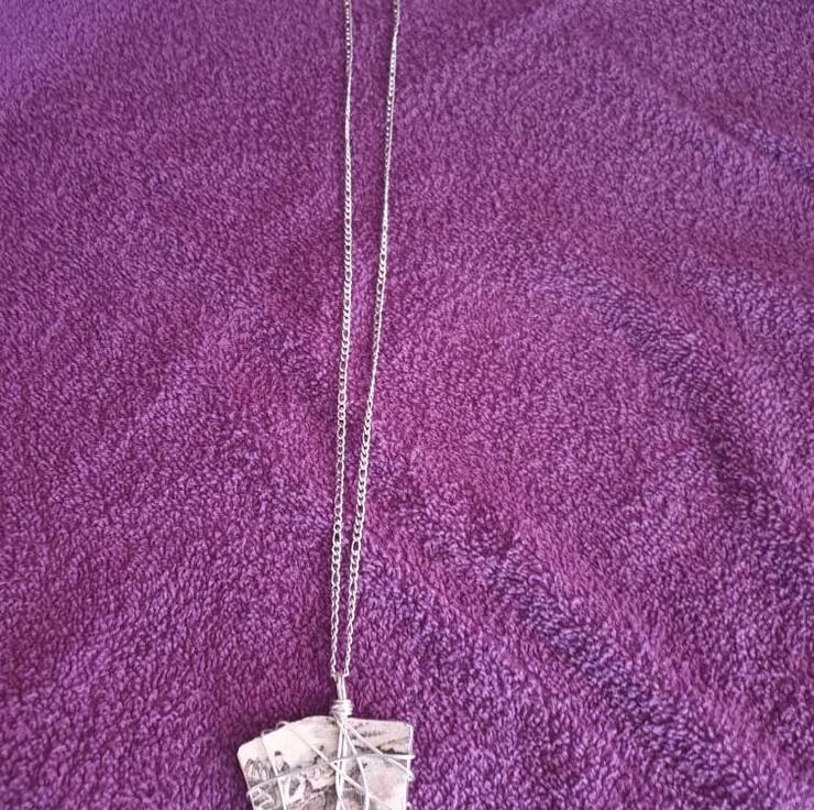 This piece of pottery shows a boating trip scene, it has been wire wrapped and a stainless steel chain has been added