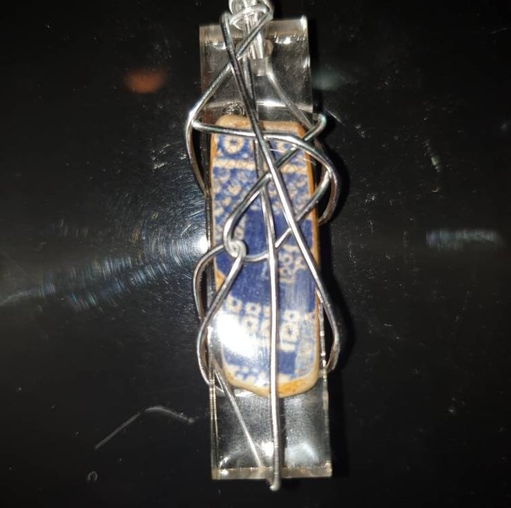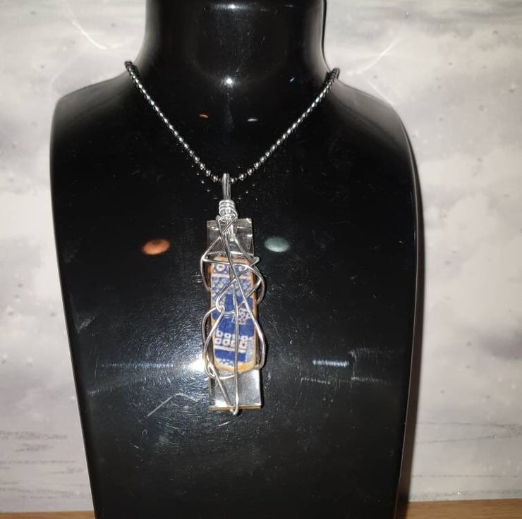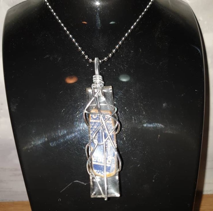 Delicately patterned mudlarking pottery, encased is resin and wirewrapped with a stainless steel chain added.