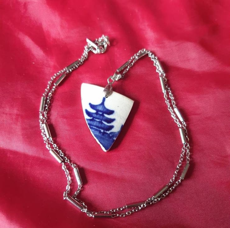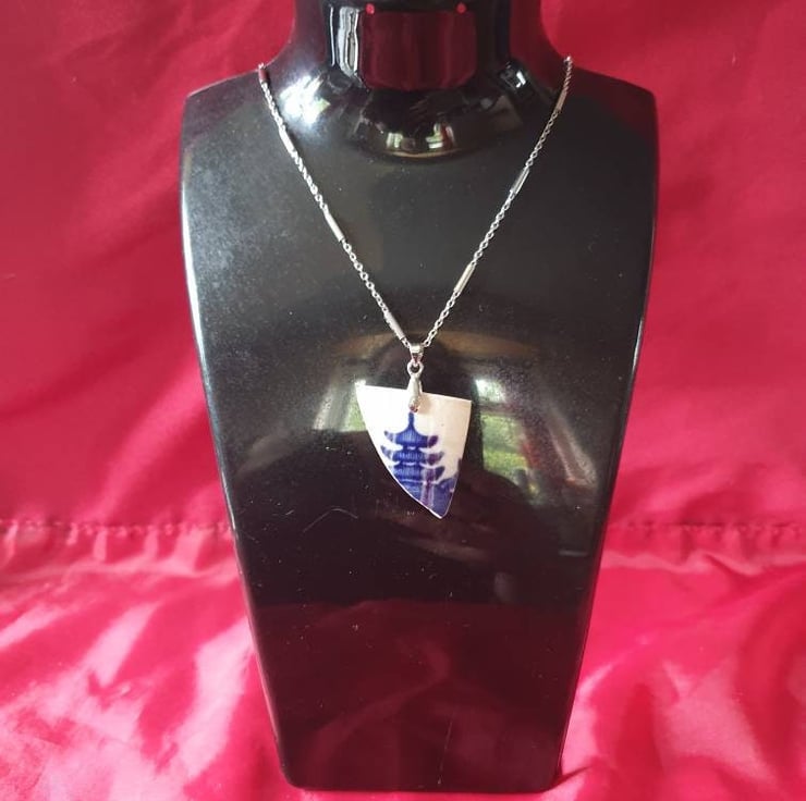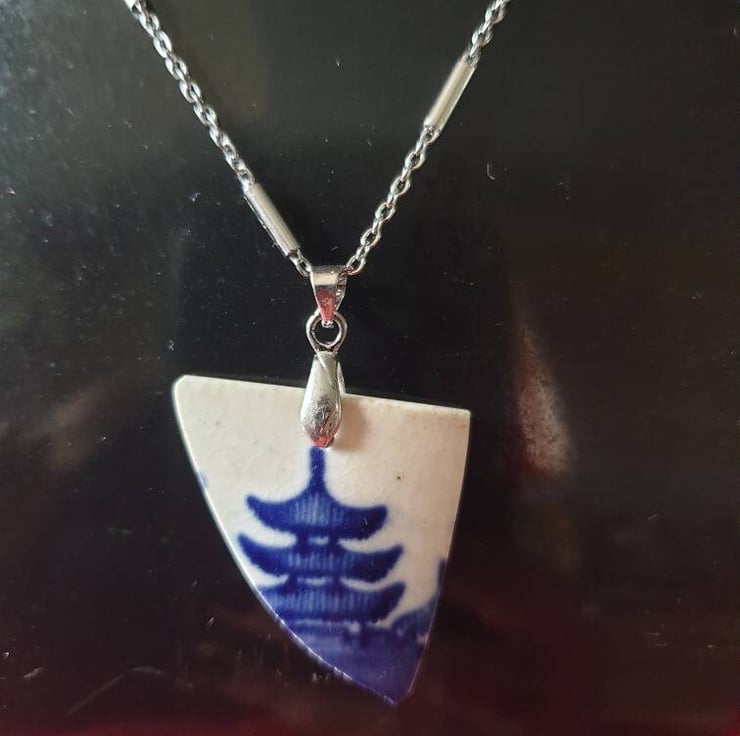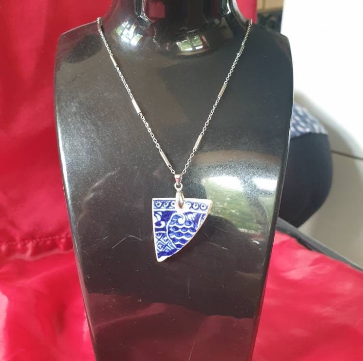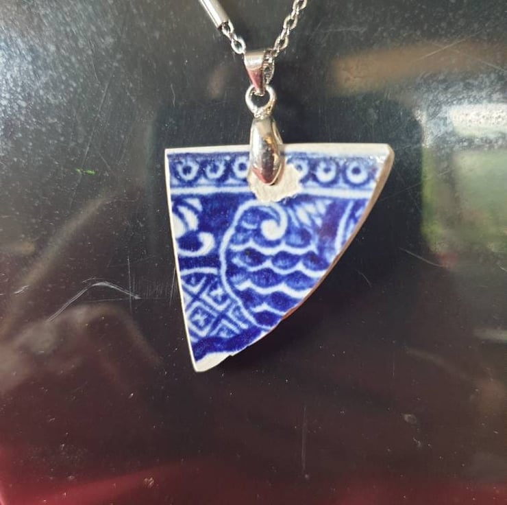 This piece was found close to the local canal and was broken as it is. This piece is actually double sided so could possibly be worn either way round. A stainless steel chain has been added
