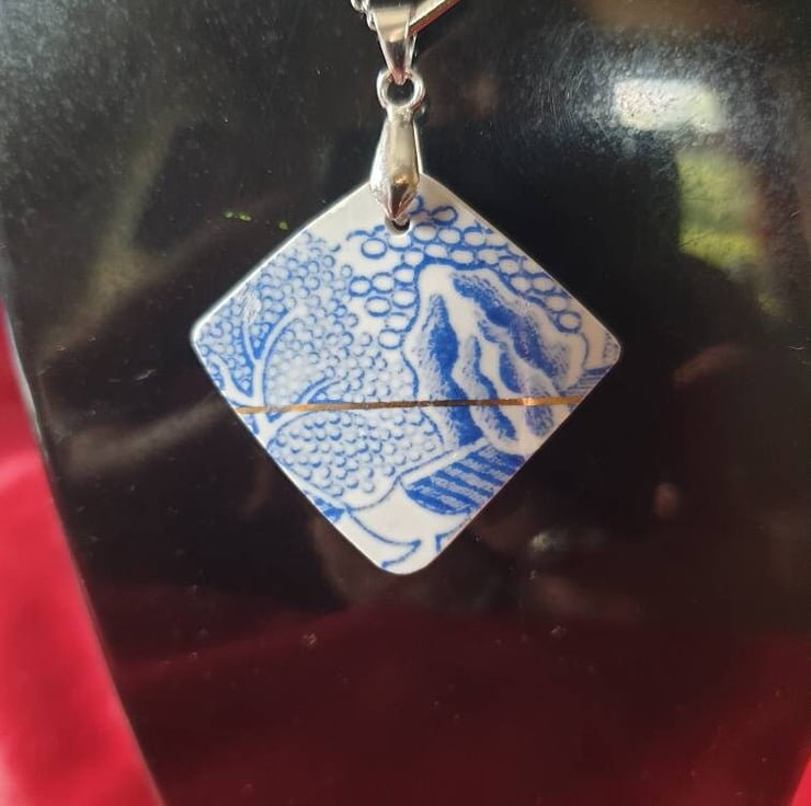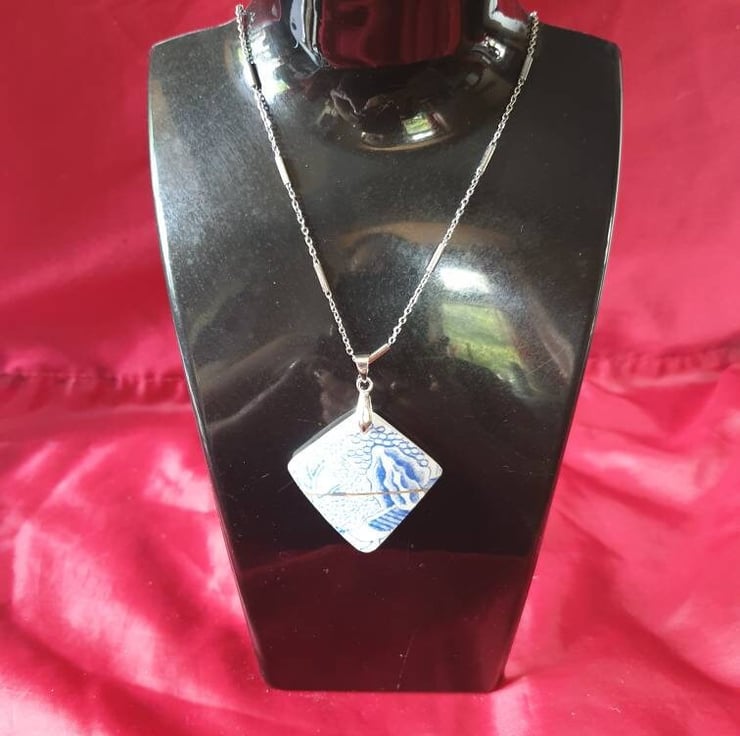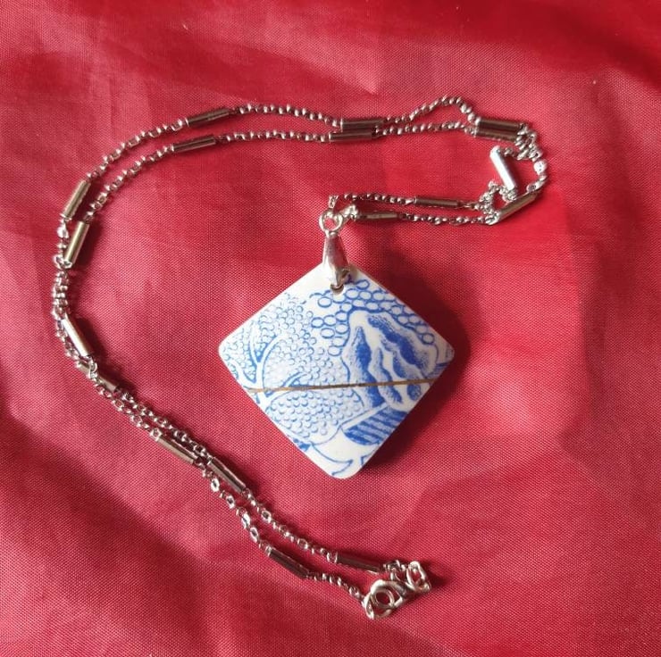 This beautiful piece was found in the river bank and had to be worked to remove the chips and other damage that was in pottery leaving behind the lovely tree tops. The chain I've added is stainless steel.