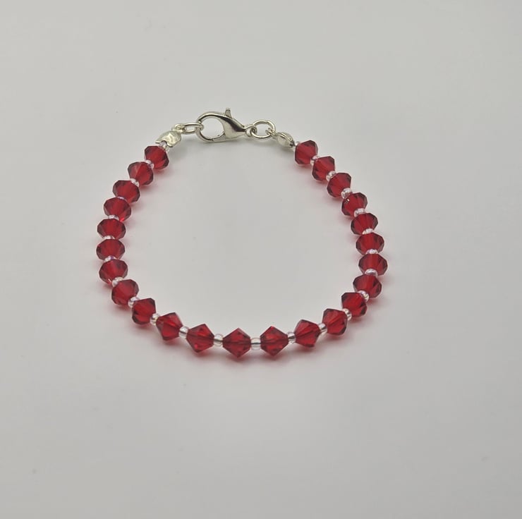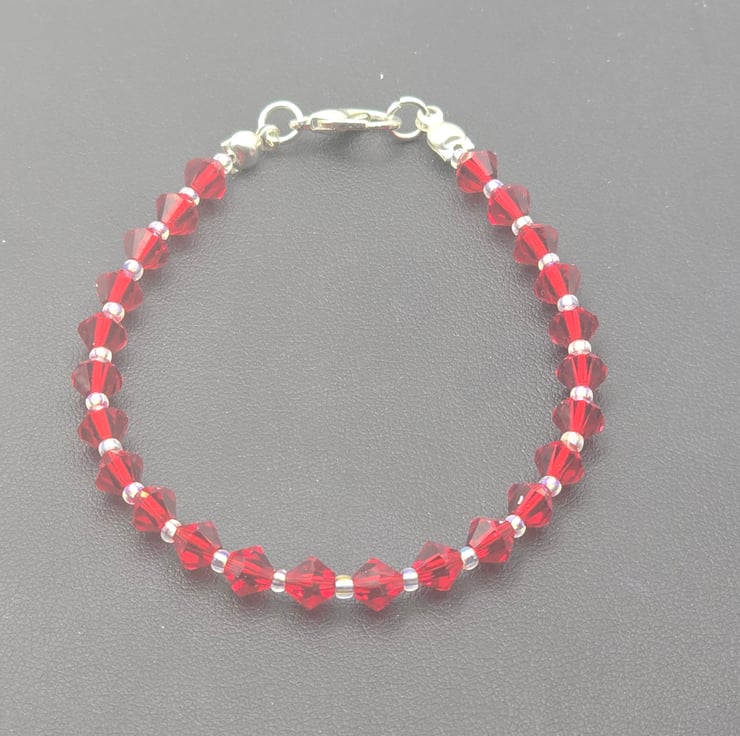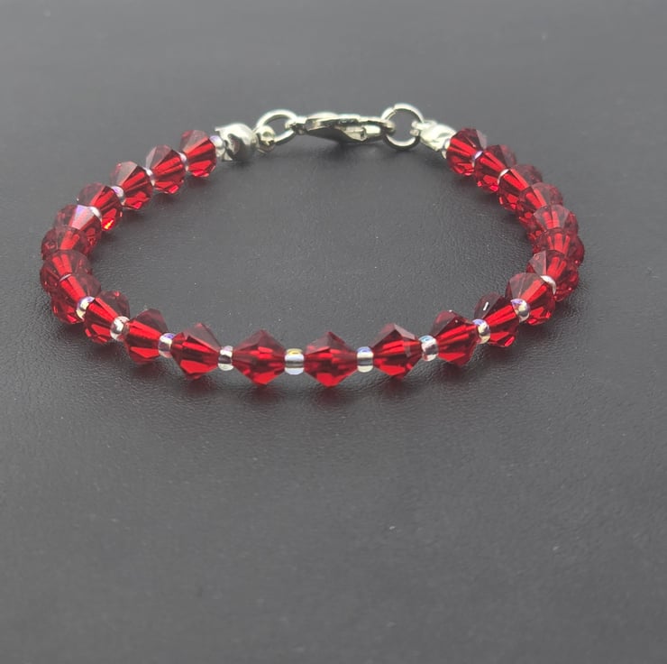 The bracelet was made using 5mm Preciosa Crystal Bicones in the colour Siam. The Preciosa Crystal Bicones are all the way around the bracelet and have small crystal AB seed beads in between. The beads are on a thin beading wire and fasten with a silver clasp.