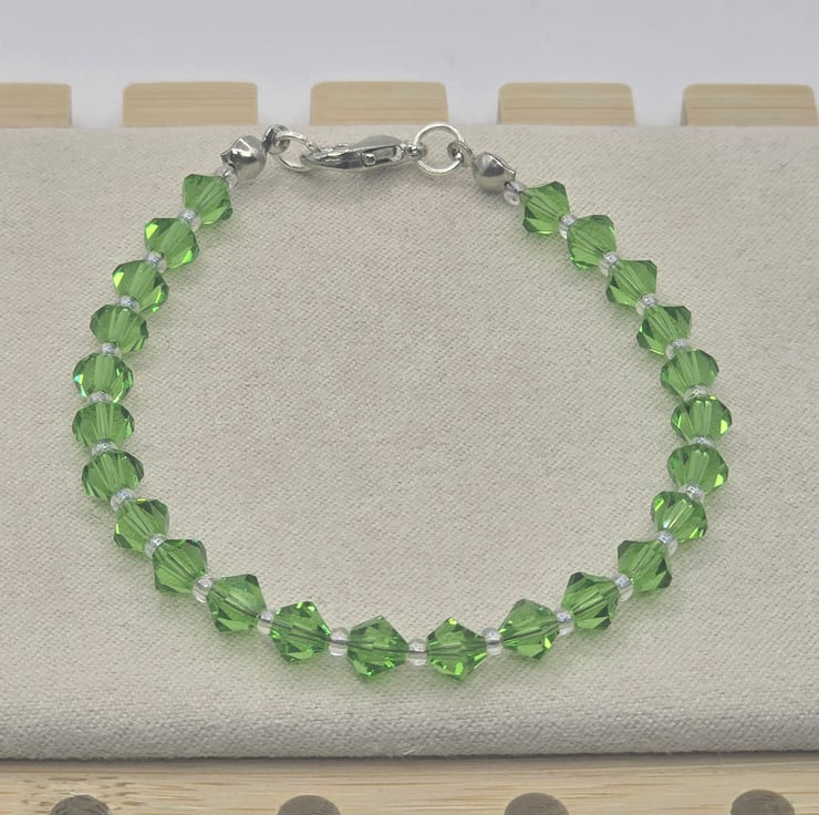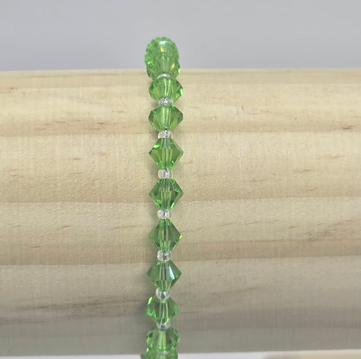 The bracelet was made using 5mm Preciosa Crystal Bicones in the colour Peridot. The Preciosa Crystal Bicones are all the way around the bracelet and have small crystal AB seed beads in between. The beads are on a thin beading wire and fasten with a silver clasp.