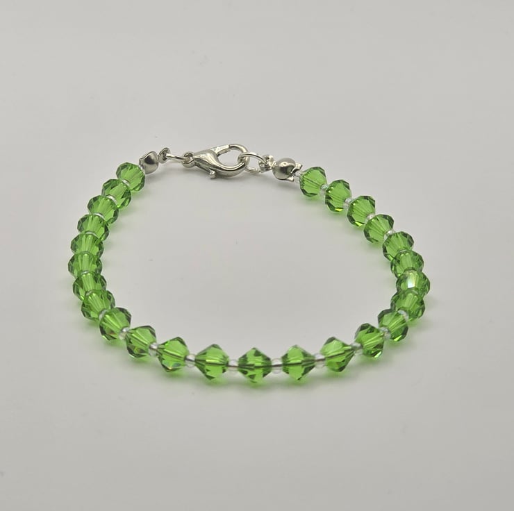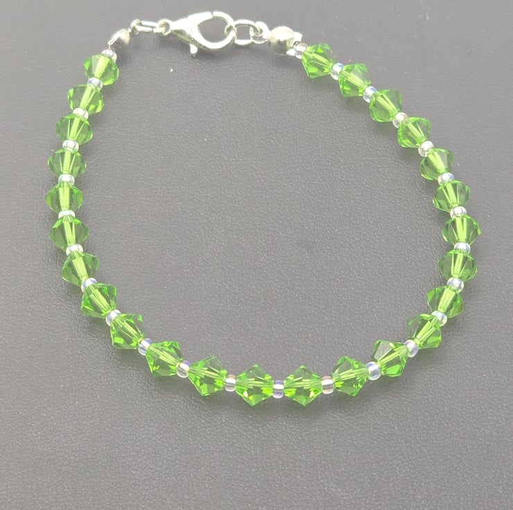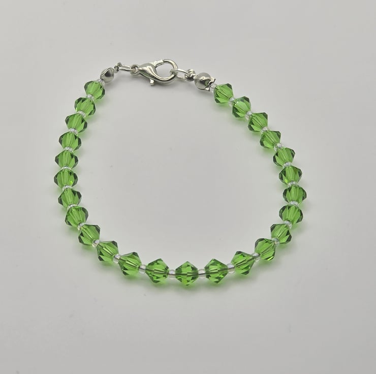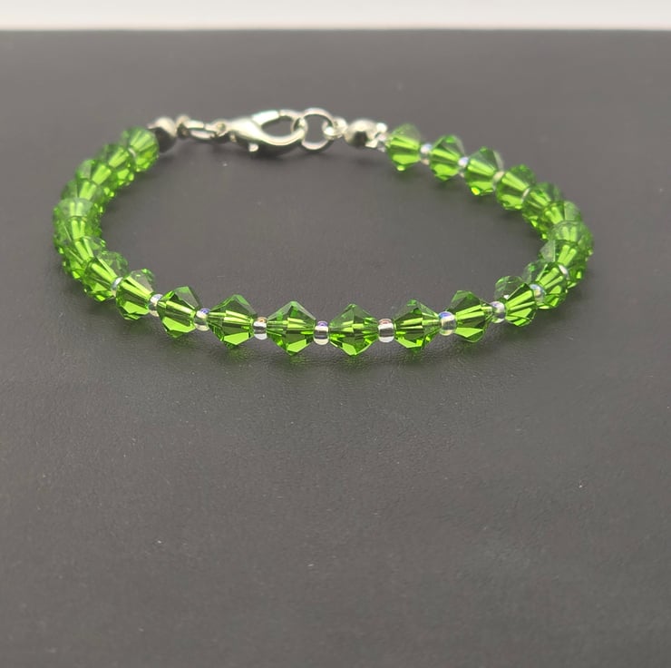 The bracelet was made using 5mm Preciosa Crystal Bicones in the colour Peridot. The Preciosa Crystal Bicones are all the way around the bracelet and have small crystal AB seed beads in between. The beads are on a thin beading wire and fasten with a silver clasp.