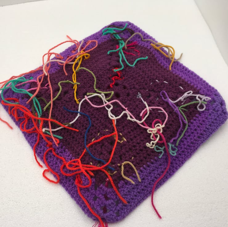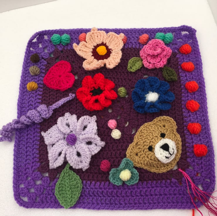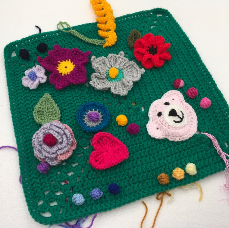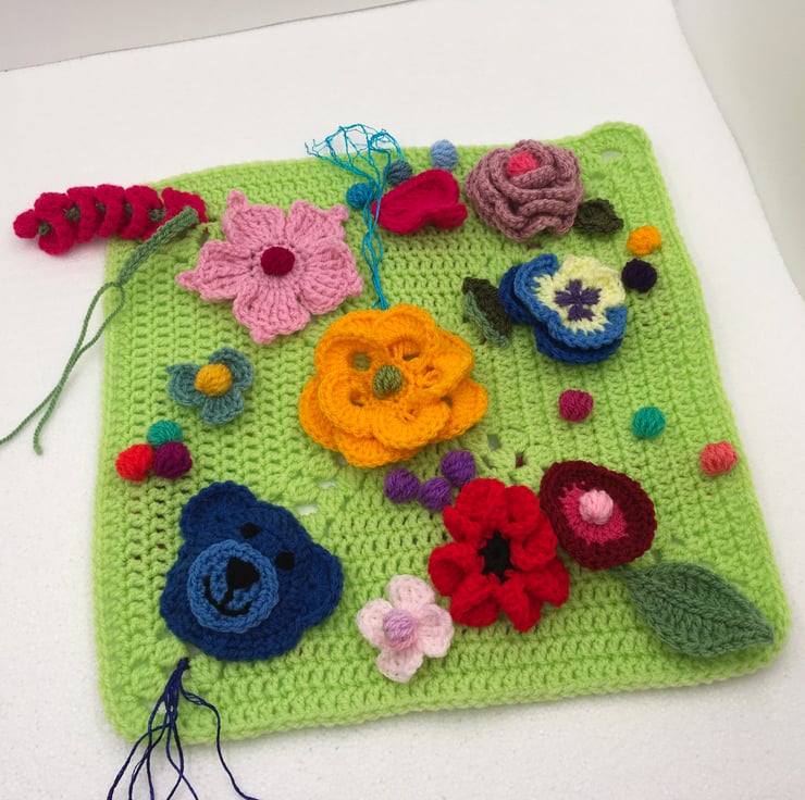 Made with easy care, acrylic yarn, the flower decorations are attached by knotting the yarn ends through the base block to leave lots of strands of yarn on the underside, which gives another lot of twiddly bits. The flowers are not fully stitched down which allows them to be lifted and then smoothed back in place.