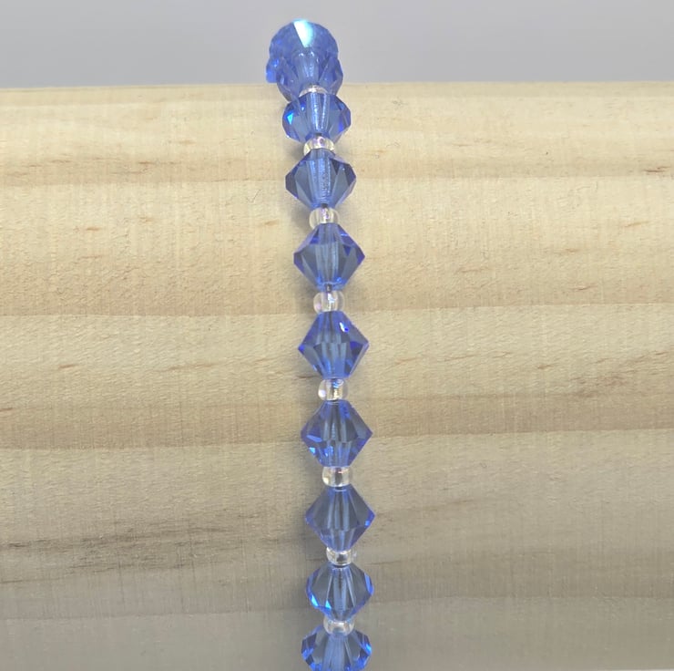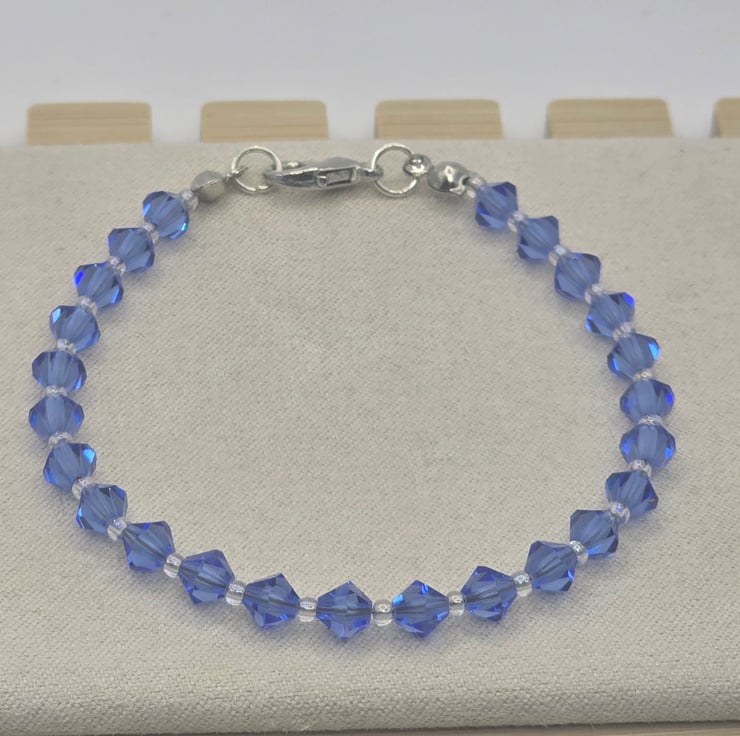 The bracelet was made using 5mm Preciosa Crystal Bicones in the colour Sapphire. The Preciosa Crystal Bicones are all the way around the bracelet and have small crystal AB seed beads in between. The beads are on a thin beading wire and fasten with a silver clasp.