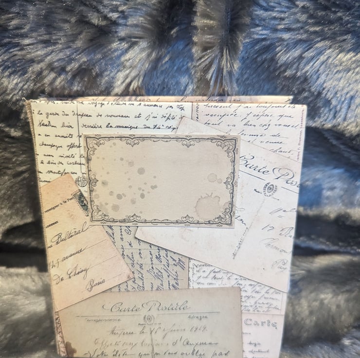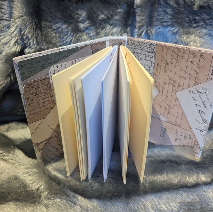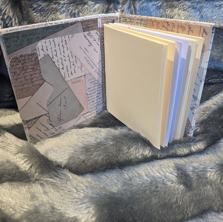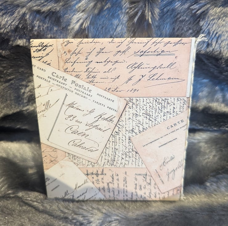 4 x 3 3/4 inch notebook/journal with 3/4 inch spine covered in postcard patterned paper stock