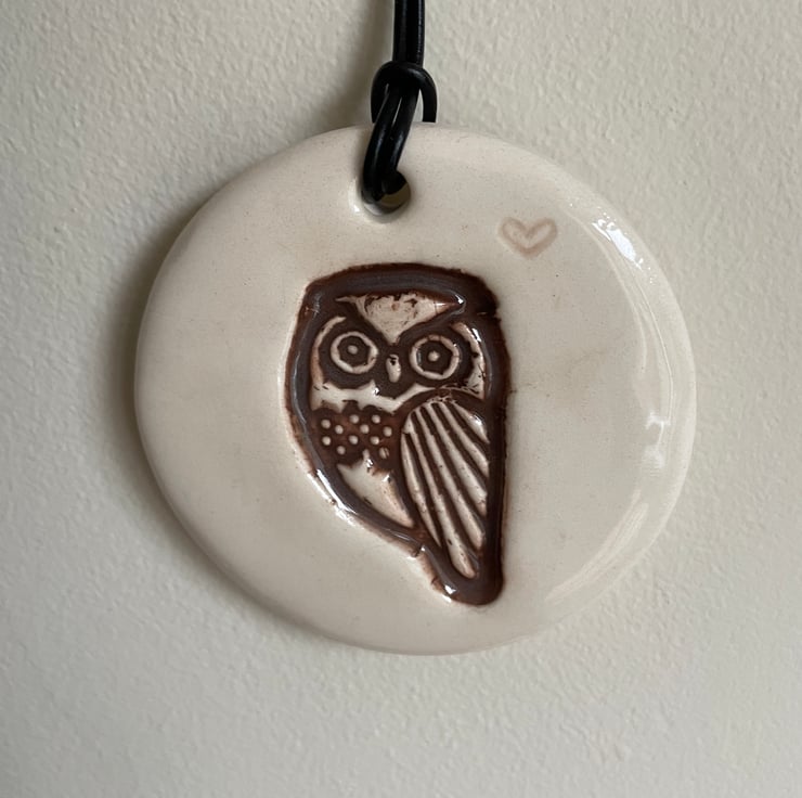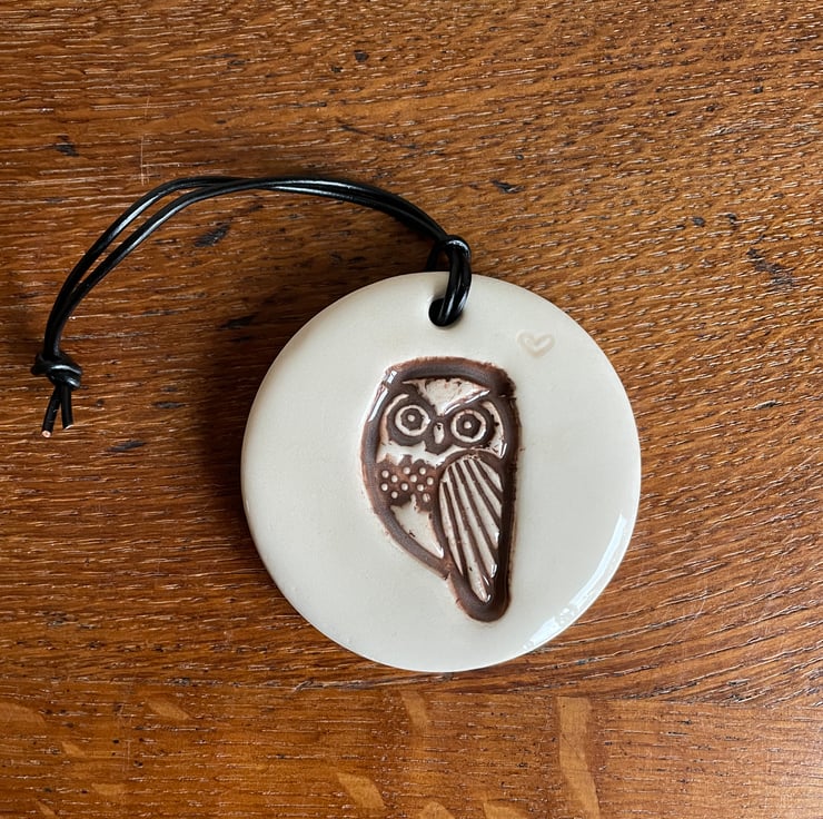 This handcrafted ceramic plaque has been created using the slab-work method and embossed with an owl design before it is cut into a circular shape. Once dried it has been bisque fired to 1000C, after a gentle sanding it has been hand-painted with a dark brown underglaze with a clear glaze added. After glazing it has had a second firing in the kiln to 1160C.