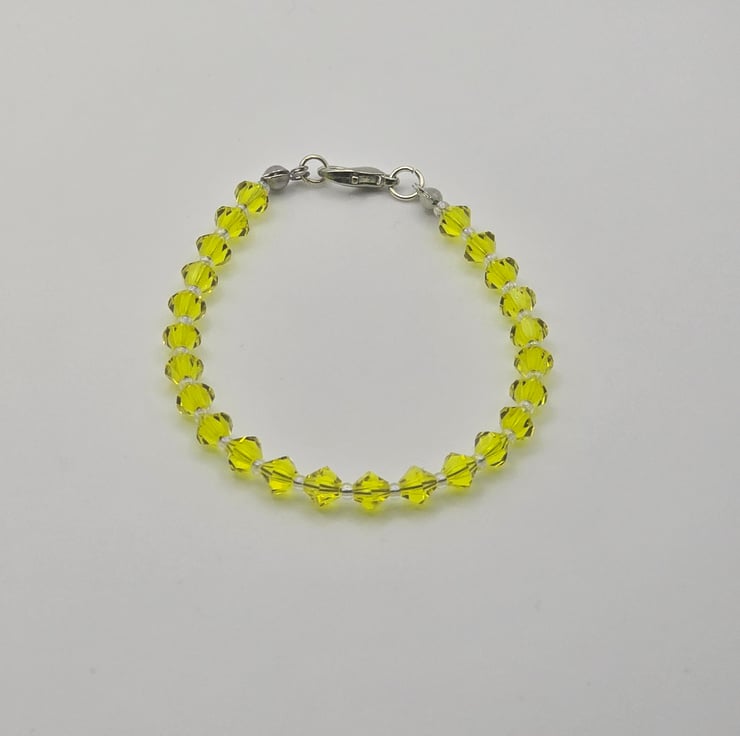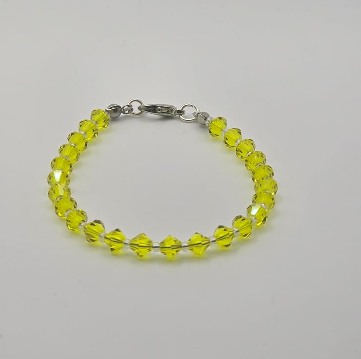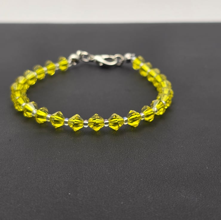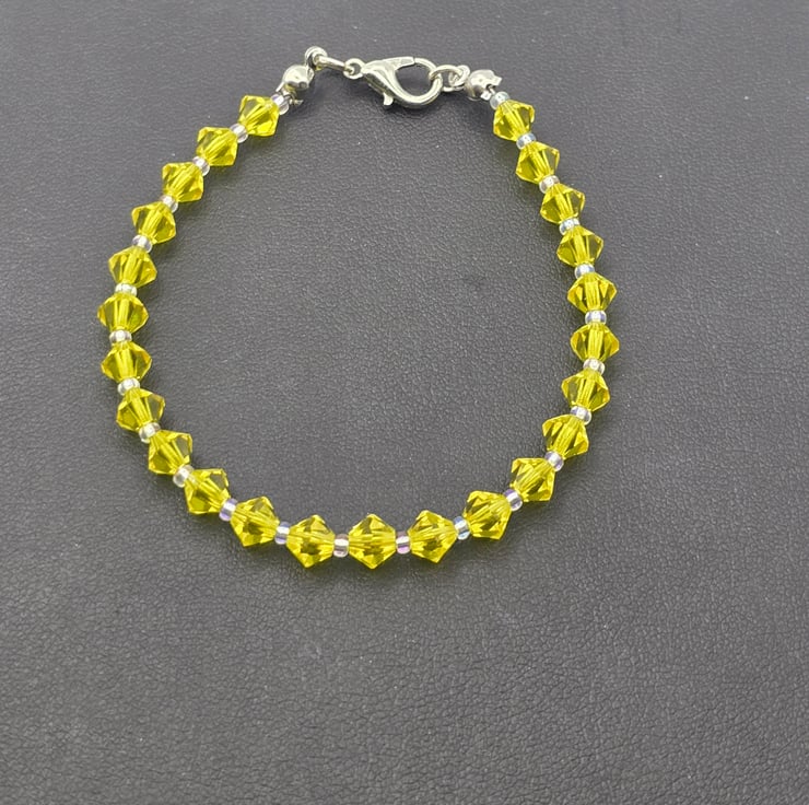 The bracelet was made using 5mm Preciosa Crystal Bicones in the colour Citrine. The Preciosa Crystal Bicones are all the way around the bracelet and have small crystal AB seed beads in between. The beads are on a thin beading wire and fasten with a silver clasp.