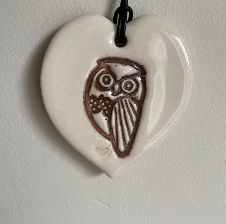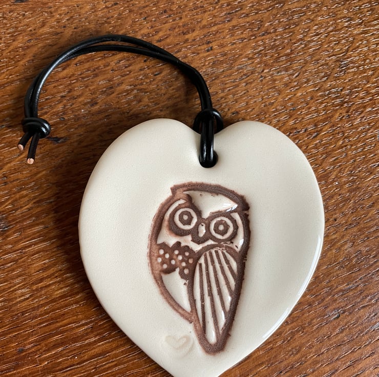 This handcrafted ceramic plaque has been created using the slab-work method and embossed with an owl design before it is cut into a heart shape. Once dried it has been bisque fired to 1000C, after a gentle sanding it has been hand-painted with a dark brown underglaze with a clear glaze added. After glazing it has had a second firing in the kiln to 1160C.