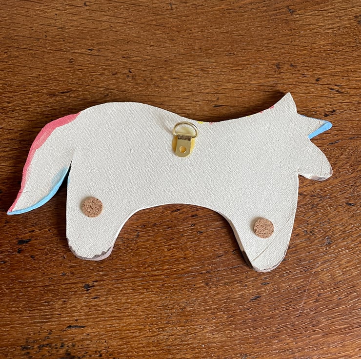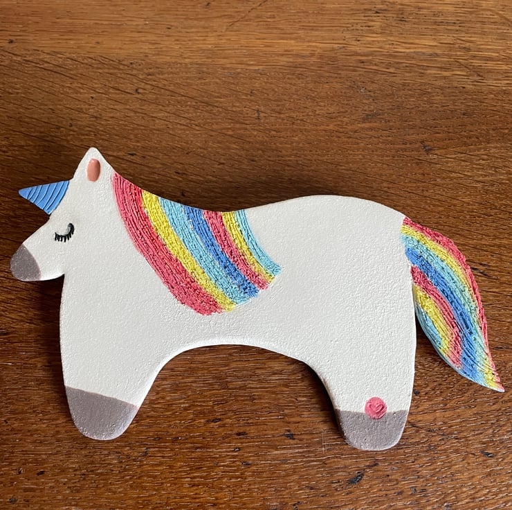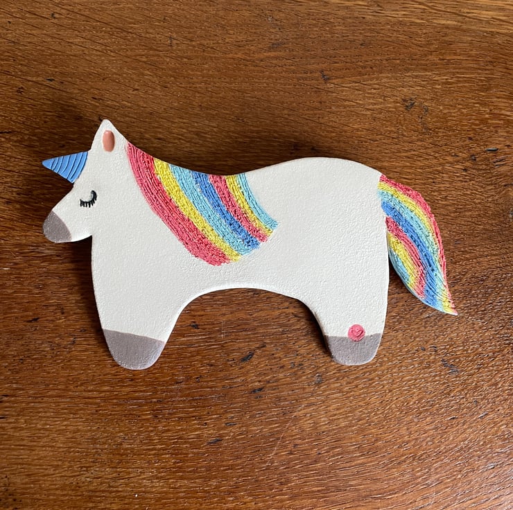 This handcrafted ceramic plaque has been created using the slab-work method and has been cut using freehand into a unicorn shape. Features have been added using pottery tools.