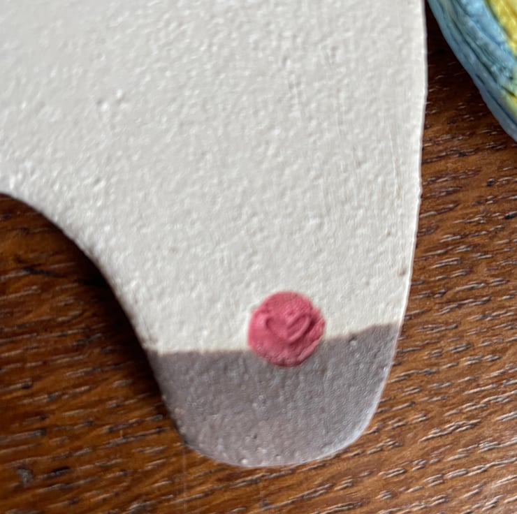 Once dried it has been bisque fired to 1000C, after a gentle sanding it has been hand-painted using a selection of rainbow-like coloured underglazes. After glazing it has had a second firing in the kiln to 1160C.