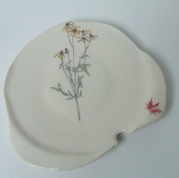 Handmade, kiln fired and decorated with hand-drawn flora that are found in the forest, this decorative piece is one of a kind.
