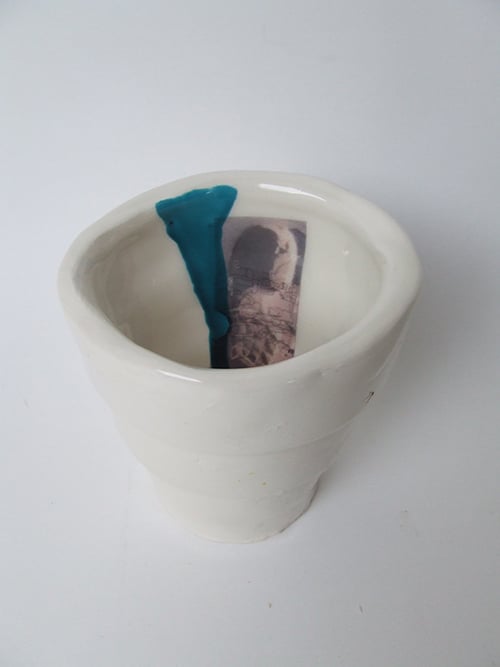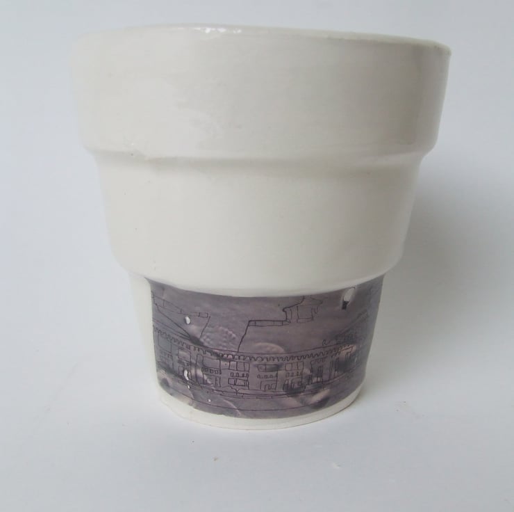 Handmade, kiln fired and decorated with hand-drawn hand drawn fine pen and water colour images made into transfers, this decorative piece is one of a kind.