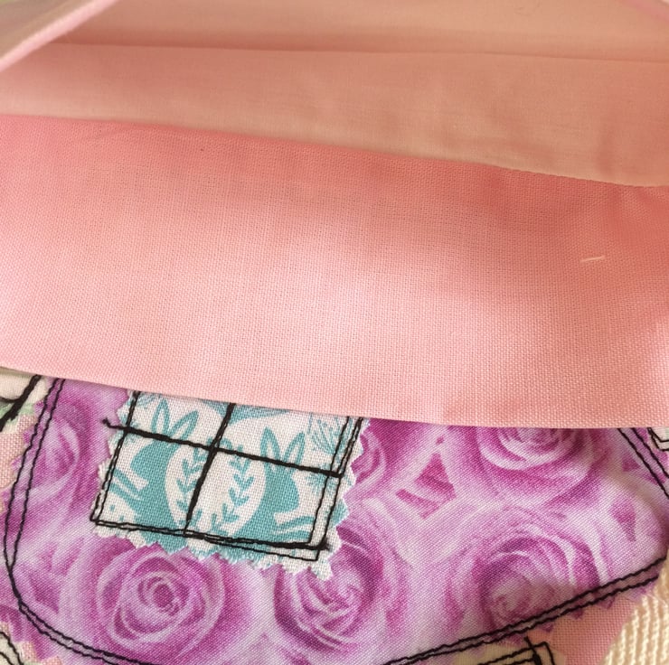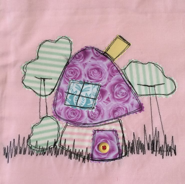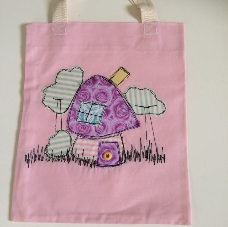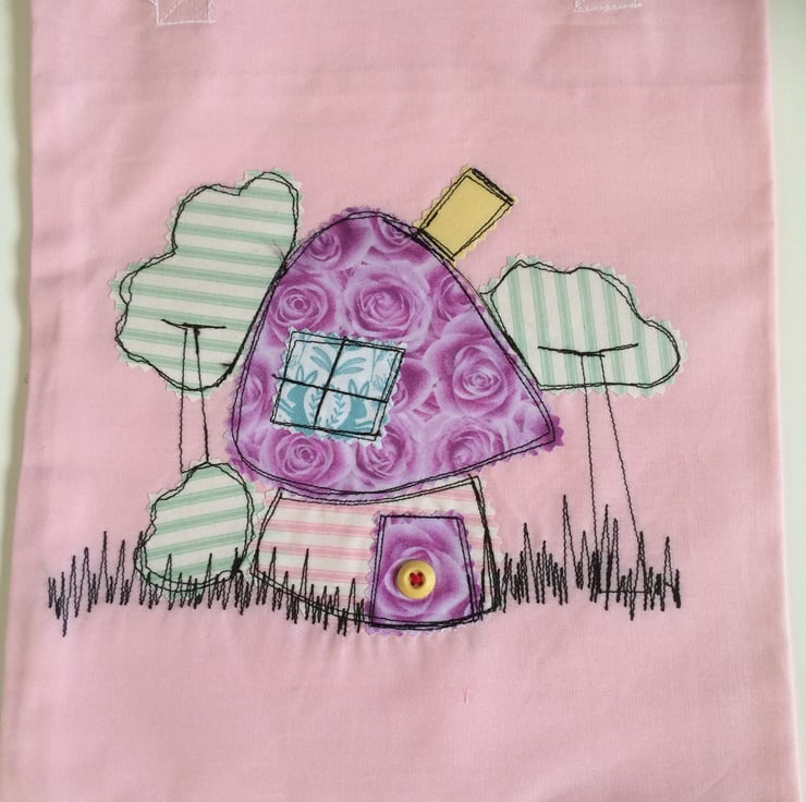 This bag is made of pink cotton fabric. I designed the 'mushroom house' to be fun. The roof and the door are lilac 'roses' fabric. There is just one window made with 'hare' printed fabric and the yellow button doorknob matches the chimney! The stitching is loosely completed in black.