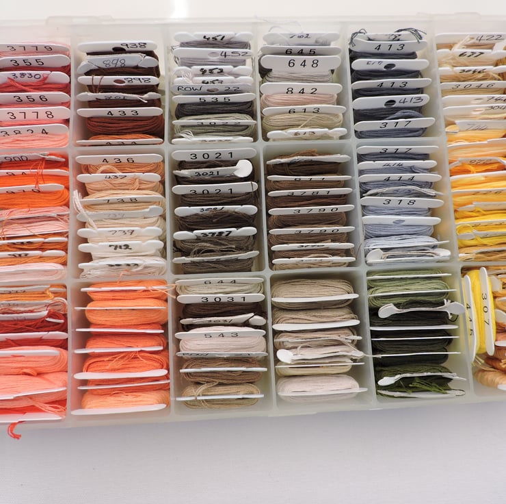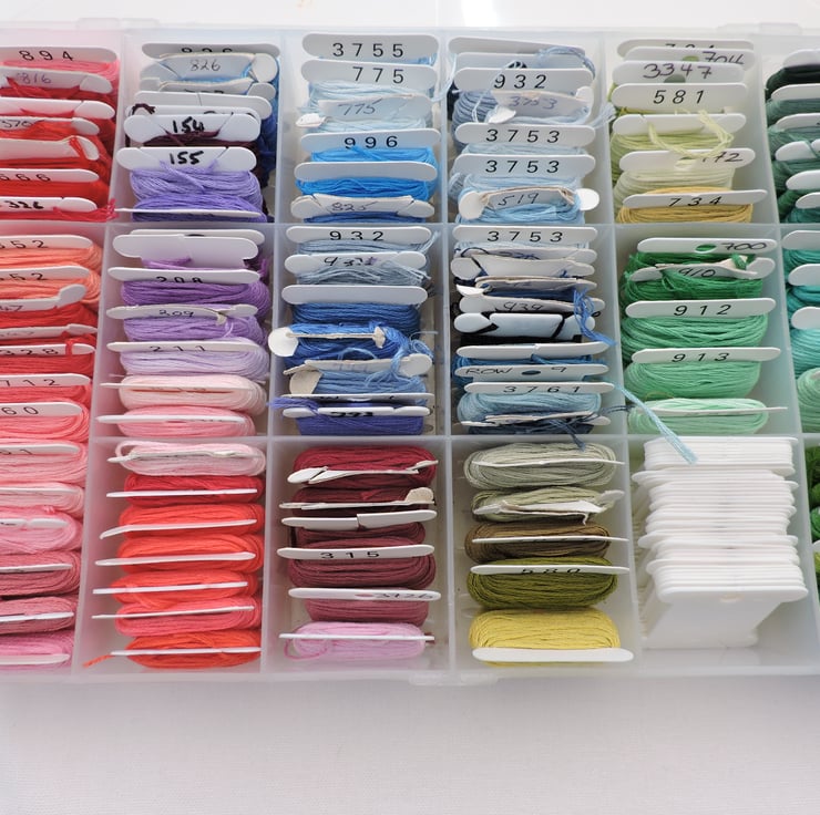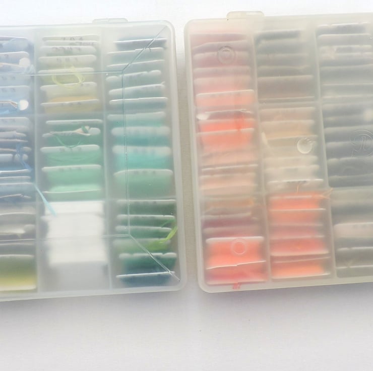 Assorted coloured embroidery threads wound onto spools. Large selection of colours. There is also some empty spools. The two containers holding the threads are also included.