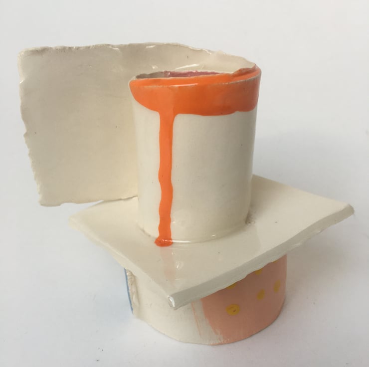 The Jugs, Mugs, Vessels & Dishes series features slab built white earthenware, coloured slip, transparent glaze and coloured onglaze.