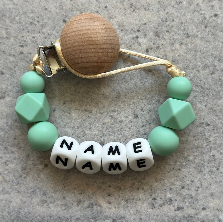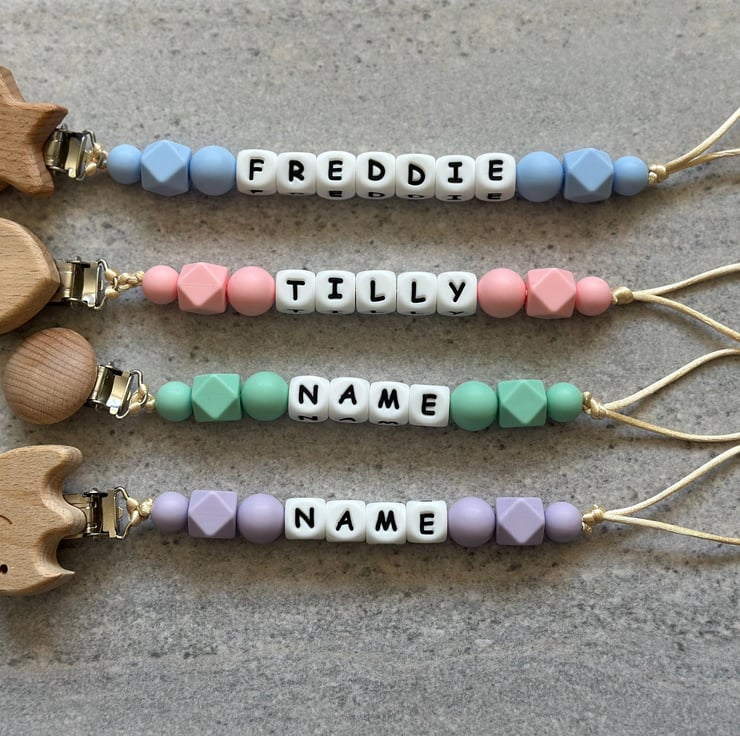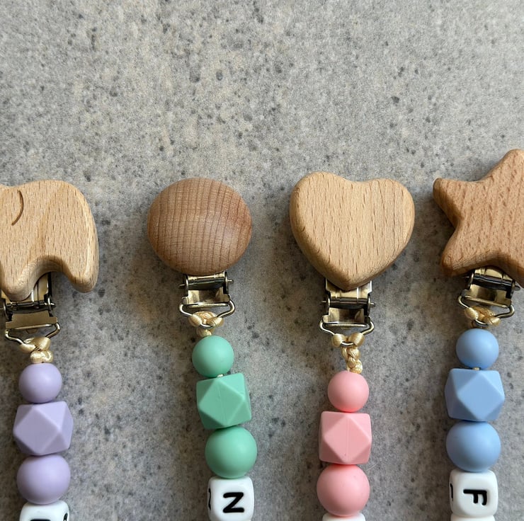 ABOUT OUR DUMMY CLIPSAll our dummy clips are lovingly made with woodenmetal clasps and are made from BPA free silicone beads with durable satin silk cord.