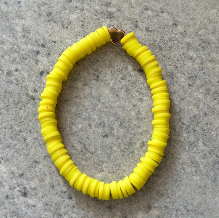 Each bracelet is made using elastic cord for ease when wearing andor the following: polymer clay disc beads, acrylic beads, plastic or metal charms.