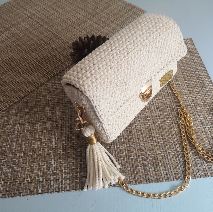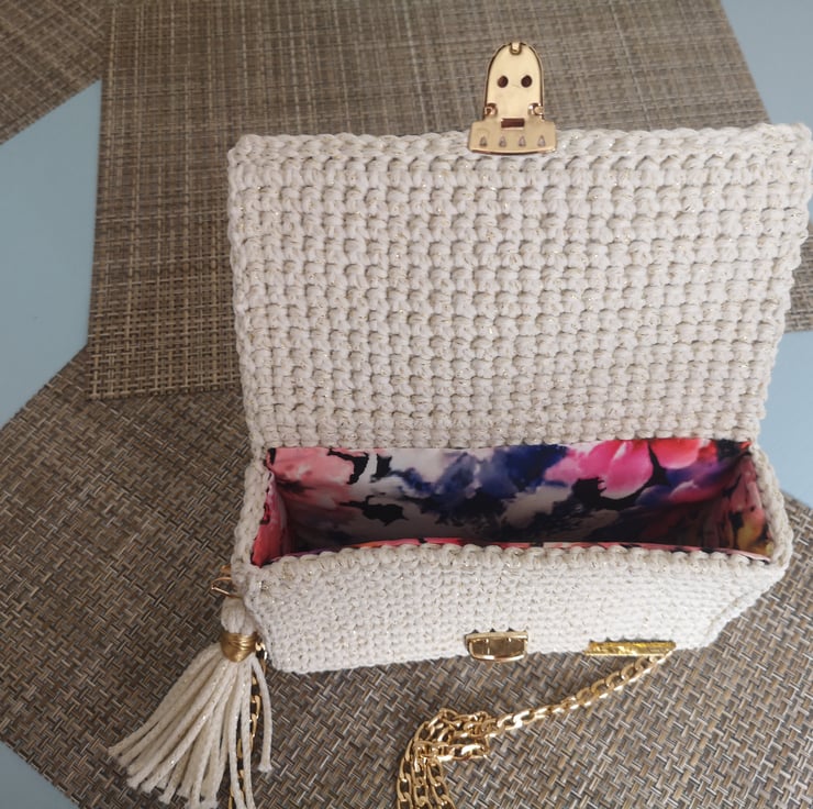 The chain is 120 cm long, bag has detachable small tassle and it is lined with colorful fabric.