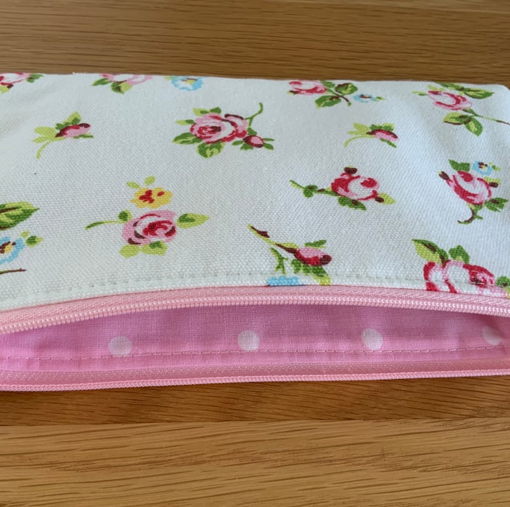 Gorgeous zipped purse made from 100% floral cotton and lined in pink spotty cotton.