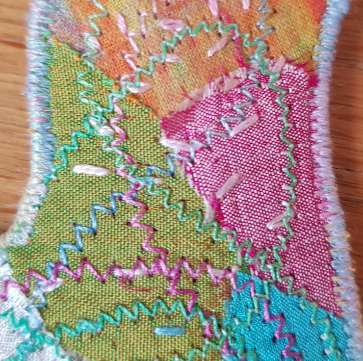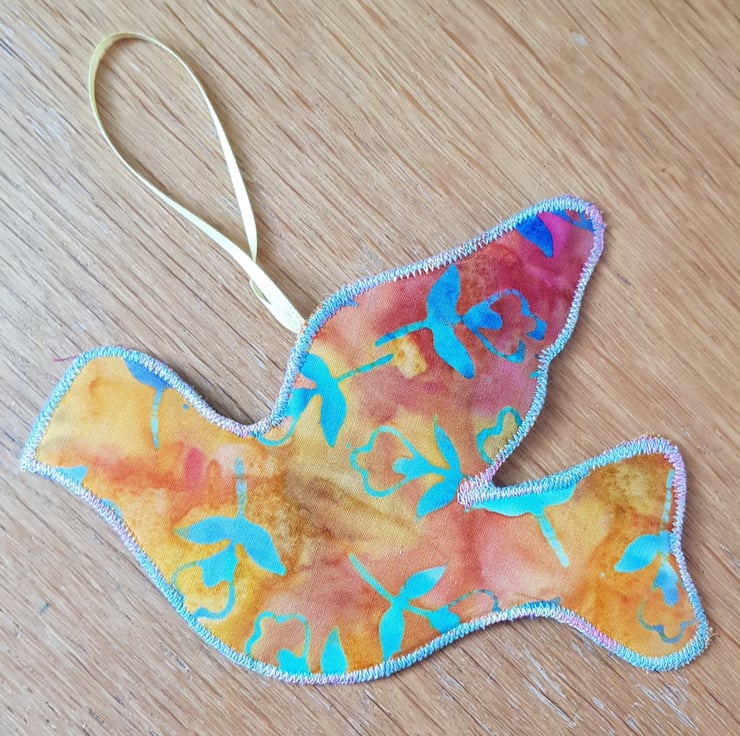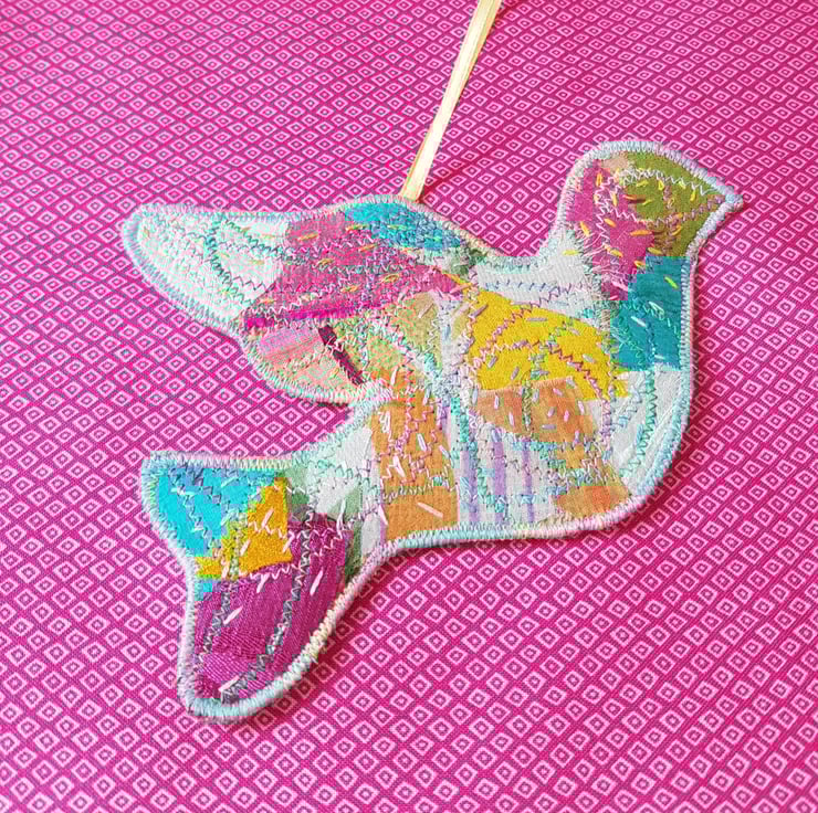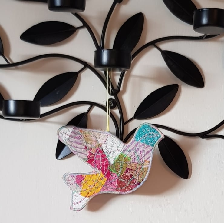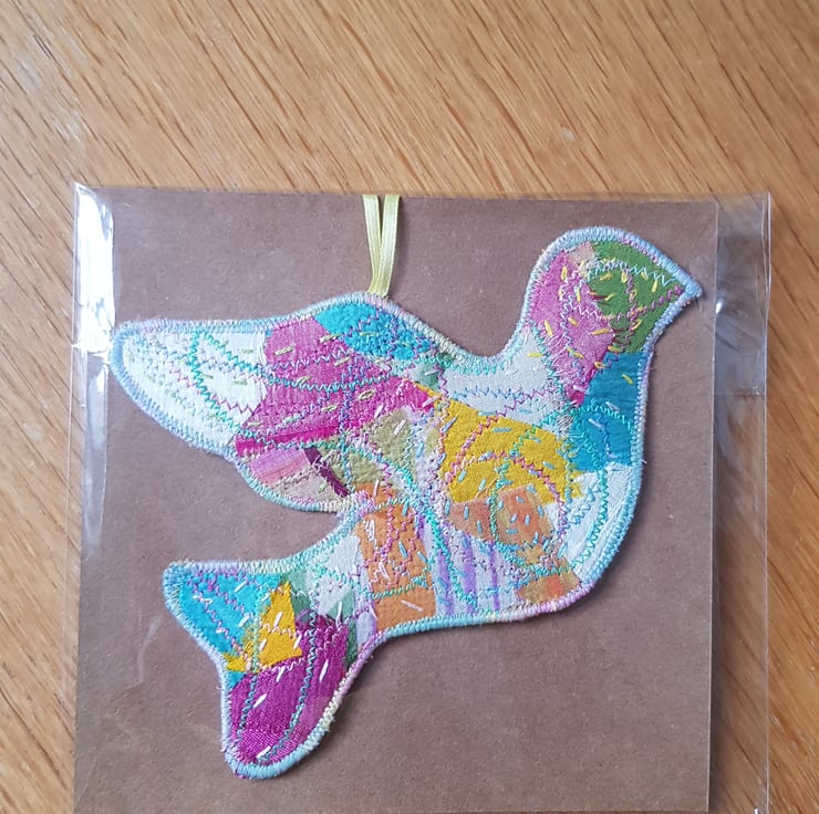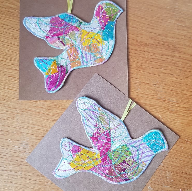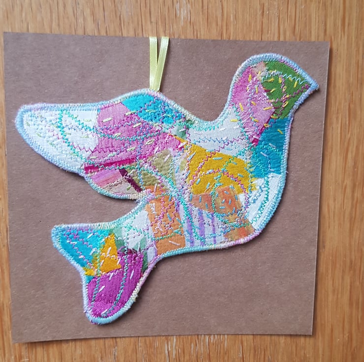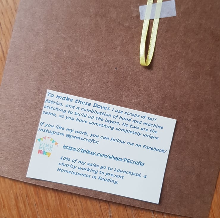 The dove is a symbol of hope and peace. Each one is unique. They are made by applying small pieces of fairly traded sari silk on to hessian. I then hand stich and machine stitch to build up the layers; I add more hand than machine stitching these days, it is so restful to do and creates a lovely effect.