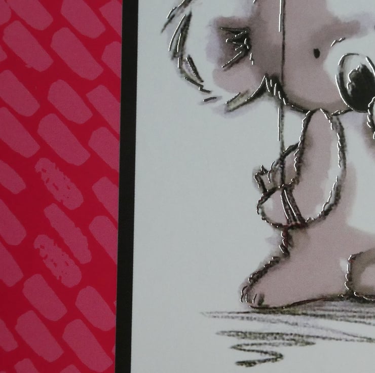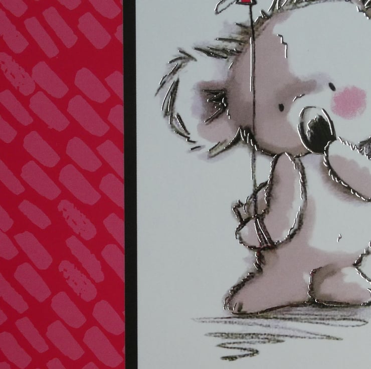 Printed on quality gloss card in shades of pink, red, grey and black with silver foiled details the main image shows a cute koala blushing with embarrassment and holding a red balloon.
