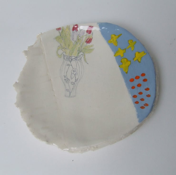 Upon retiring from a long and happy career as a physiotherapist, I embarked upon an applied arts degree. This led me to ceramics, where I have discovered a passion for combining glazed earthenware, lightbox drawings and gold leaf to create completely unique decorative pieces.