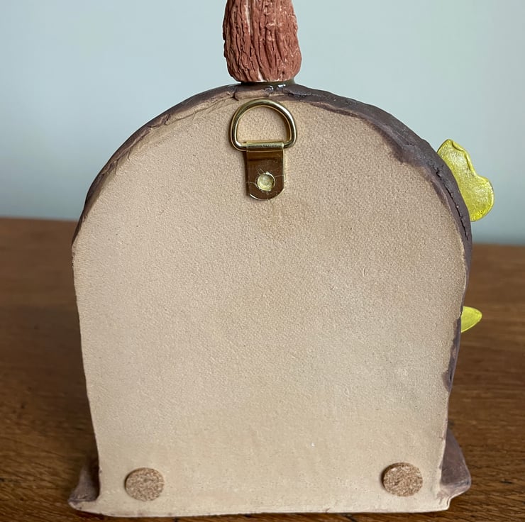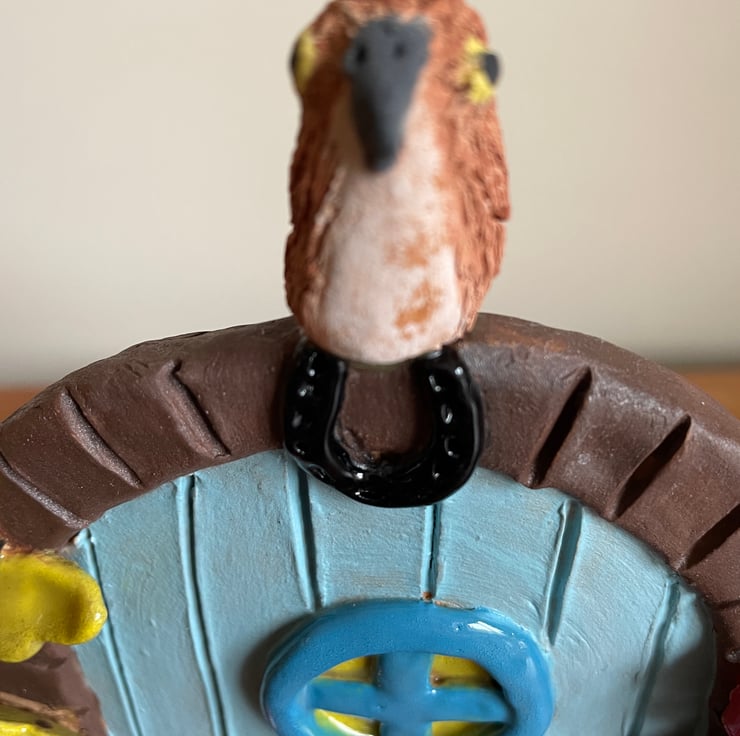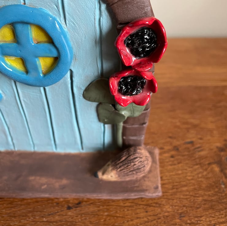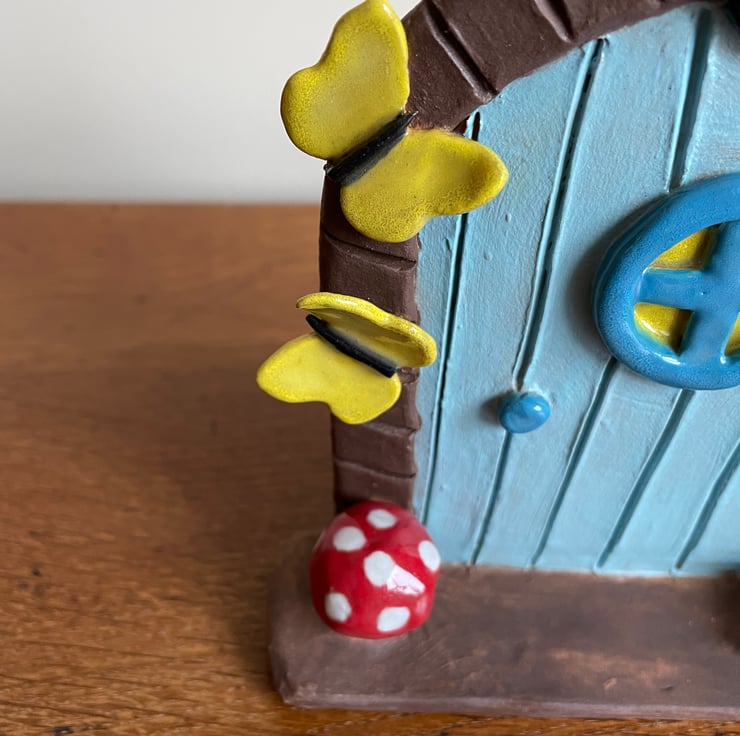 Handmade with white stoneware clay using the slab method. Each feature has been individually moulded and attached using slip. After the initial bisque firing the fairy door has been gently sanded before applying two coats of underglaze to enhance the features. The window, doorknob, sunflowers, sunshine yellow butterflies, and toadstool have all been clear glazed to add a shiny effect. It has been stoneware fired in the kiln to 1260C