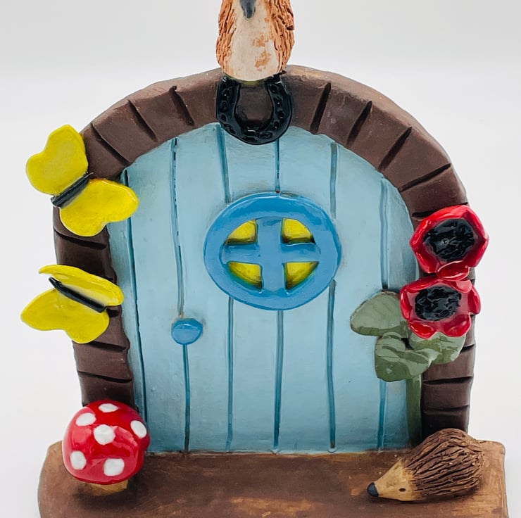 This is my one-of-a-kind magical secret fairy door is decorated with poppies, butterflies, toadstool, horseshoe together with a cute owl and hedgehog