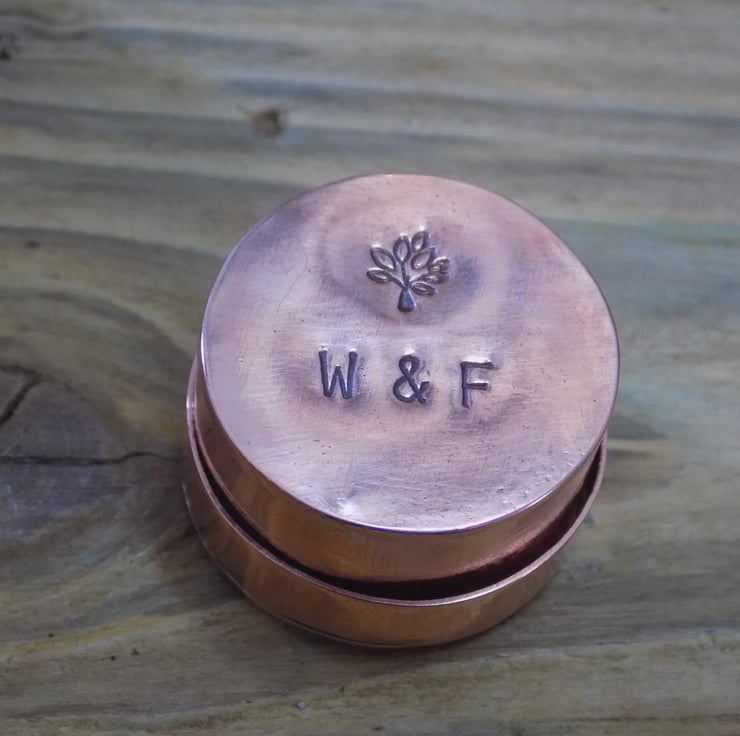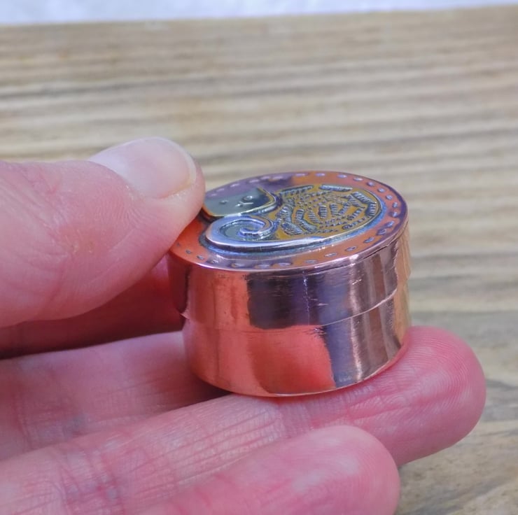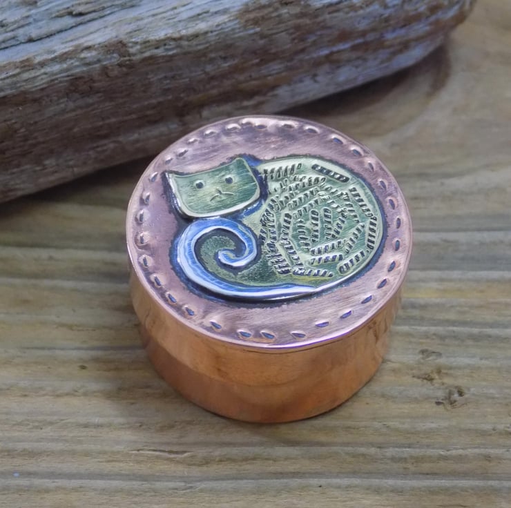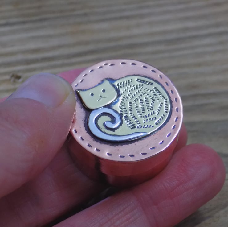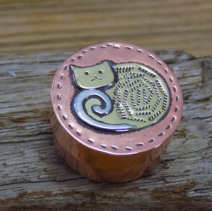 Made from copper, brass and silver sheet . This delightful mini box could be a place to store any little keepsakes or just as a collectable. It has been hand sawn, soldered ,filed , sanded and polished. A cute little cat has been added to the lid using metal punches and soldering techniques, he sports a fine curly silver tale!