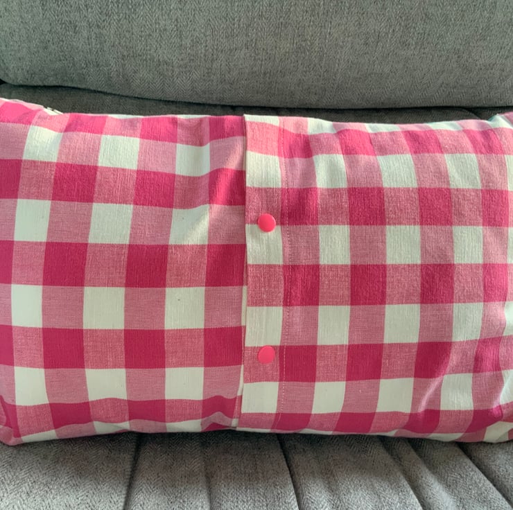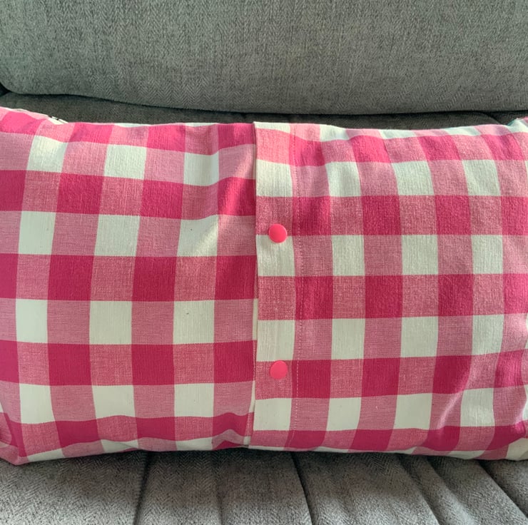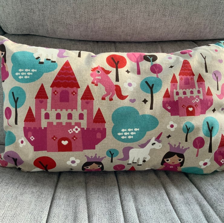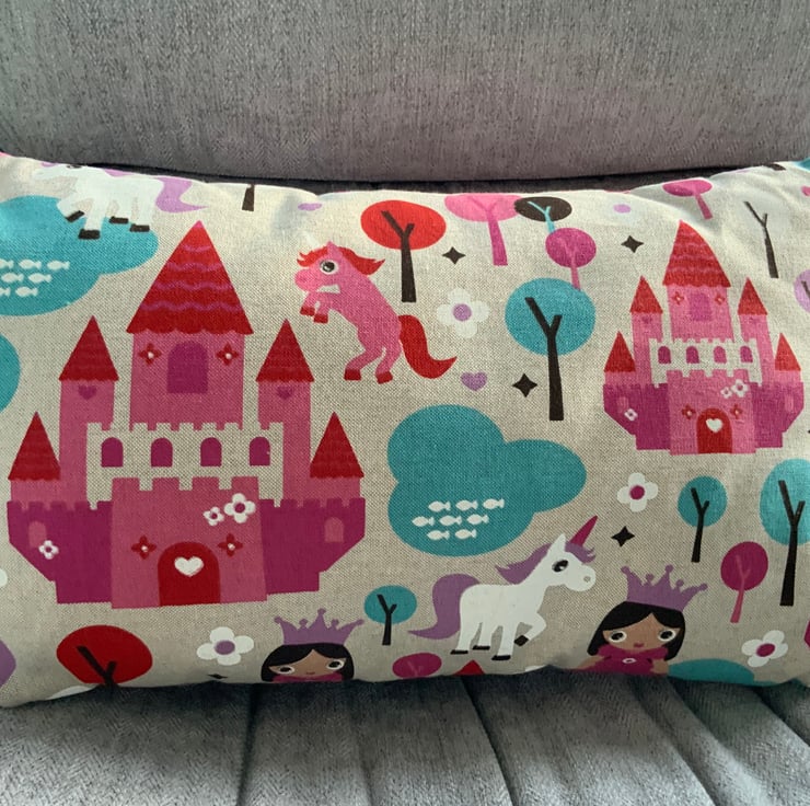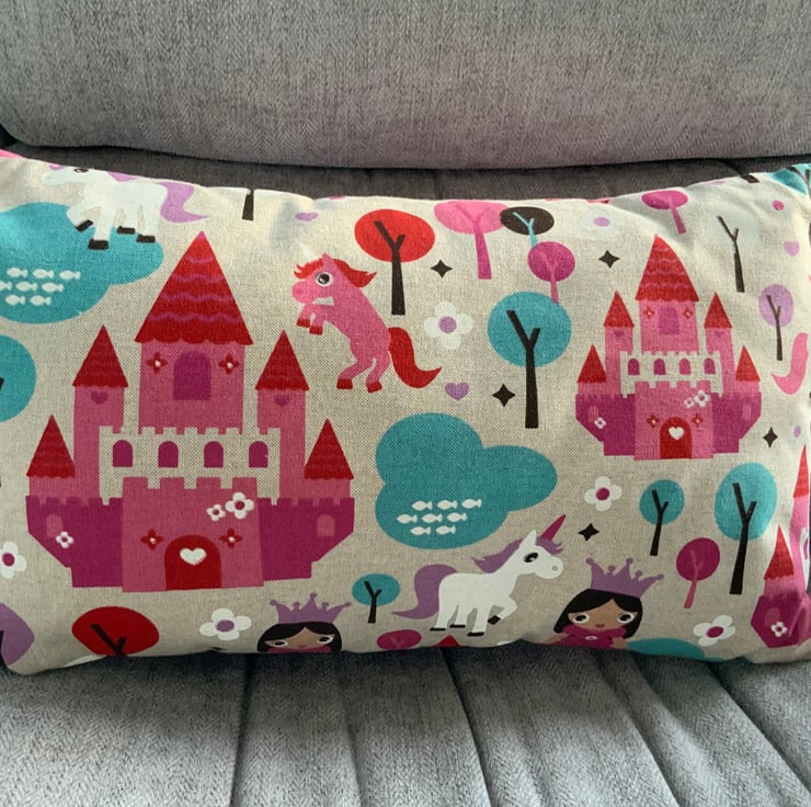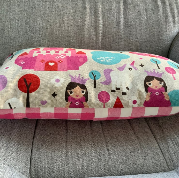 Gorgeous children’s unicorn / princess /castle cushion made with a printed linen fabric with pink and white check fabric on reverse. This has an envelope opening finished with plastic snap fasteners to hold the opening in place. The cushion inner is included.