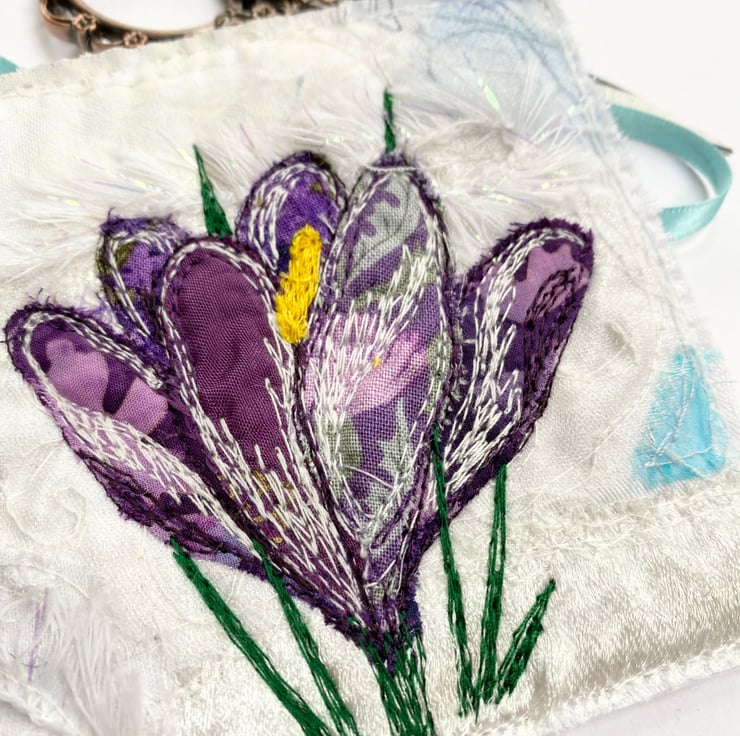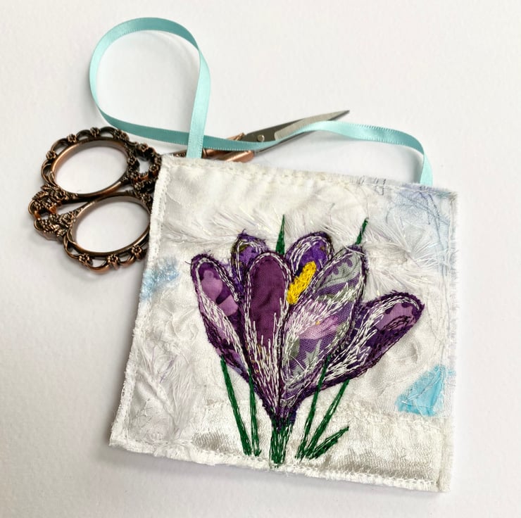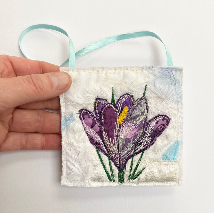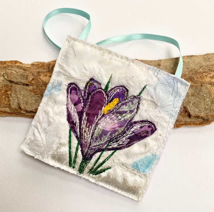 This beautiful embroidered crocus home decoration has been made from up-cycled fabrics and stitched down with free motion embroidery. It comes felt backed and measures 9.5cm, with the matching ribbon the length is 21.5cm approx.