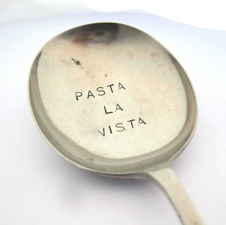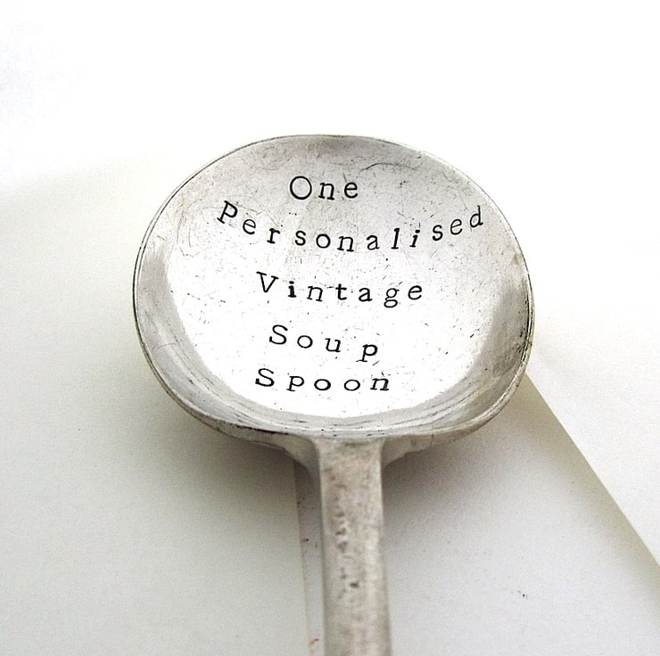 A personalised vintage soup spoon, hand stamped with your own wording of up to 40 characters (letters, numbers, punctuation, hearts). Please click the big orange 'choose options' button and put your message in the box.