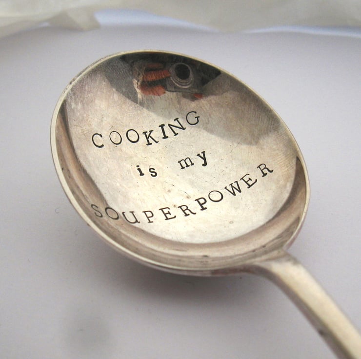 This makes the perfect gift for someone special! Tell them 'I think you're souper' or that they're a 'soupermum' or 'souperdad' (with 'souperpowers' of course!) or just label the spoon 'Dave's Soup Spoon' whether or not their name actually is Dave... Get creative with your wording and remember it doesn't have to go in straight lines, although that's the default if you haven't specified otherwise. If your chosen wording is longer than 40 characters I can probably still fit it in, just drop me a message (an extra charge may apply). Default lettering will be 3mm capital/lower case as in the first photo but let me know if you'd rather have BLOCK CAPITALS instead. The black in the letters is non-toxic waterbased acrylic ink, hand washing recommended.