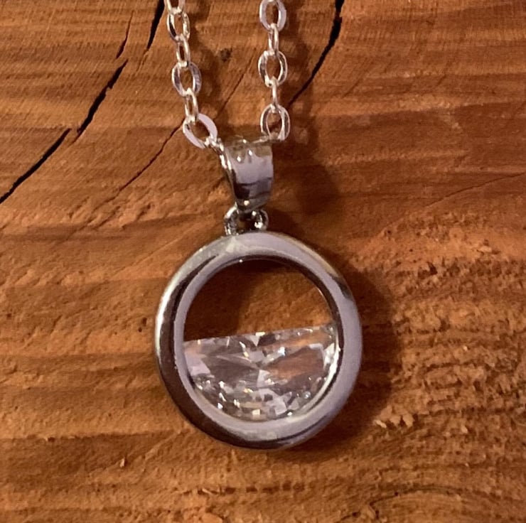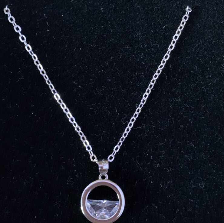 A beautiful hand cut piece of clear quarts set into a silver ring, hung on a pretty, delicate, 18" silver chain.